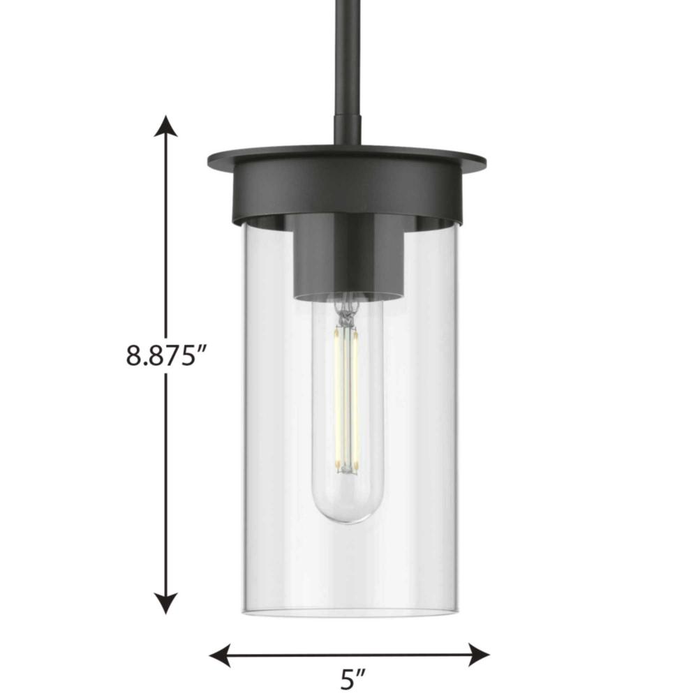 The classic design is composed of crisp, clean lines coated in a beautiful matte black finish for a touch of luxury. A light source glows within a clear, cylindrical glass shade for luxurious illumination.