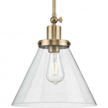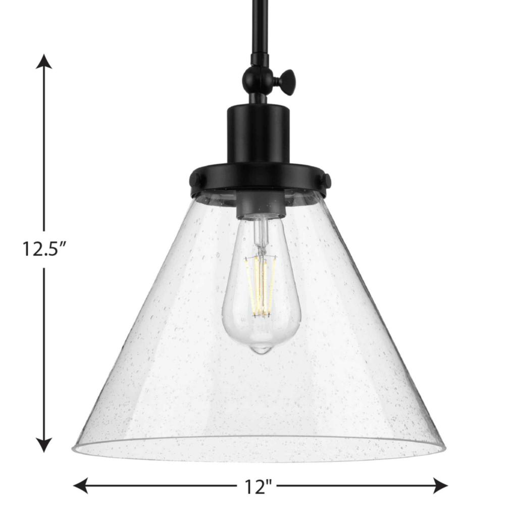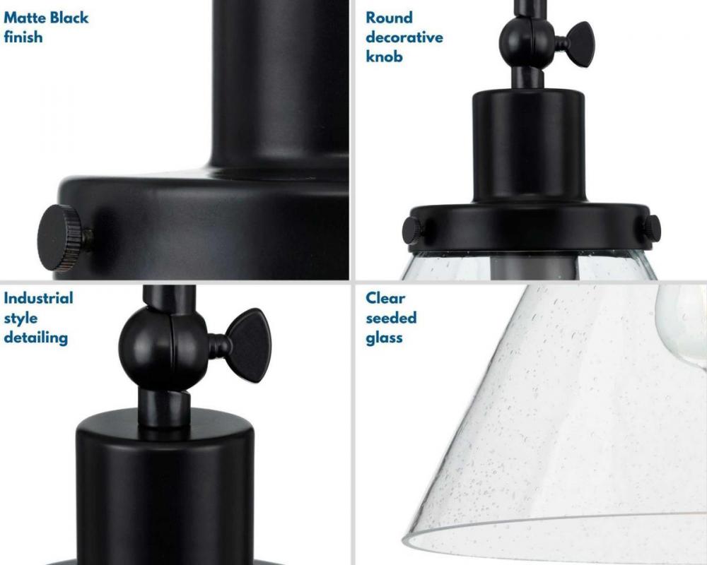 Enjoy focused task lighting with the Hinton Collection 1-Light Seeded Glass Matte Black Industrial Pendant Light. A light source glows from within a clear seeded glass shade for focused task light with unexpected visual texture. A vintage light base with round decorative knobs is coated in a sleek matte black finish for modern industrial character. The light base attaches to a metal stem that suspends from the ceiling plate.
