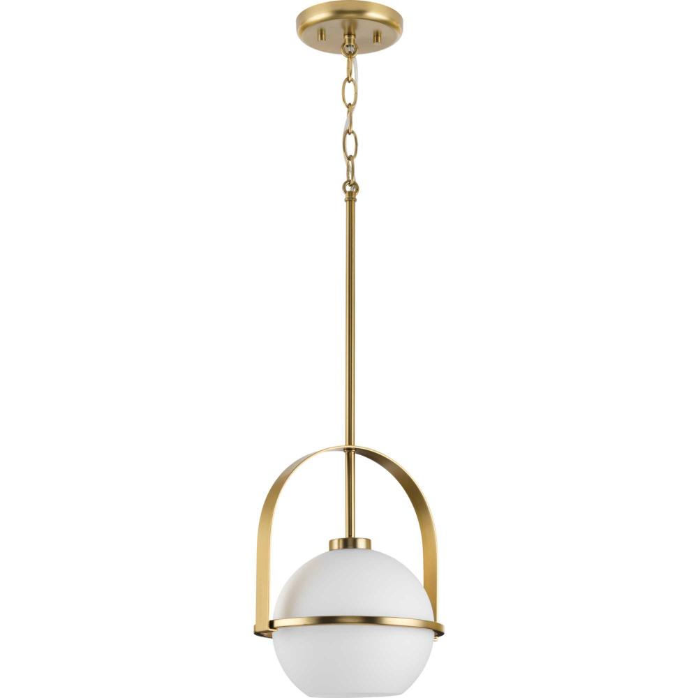 Delayne has a sophisticated style that transcends its simple design. A softly curved fitted metal framework encases an opal glass globe with slender bands creating a dynamic form. The pendant offers a refined mid-century design enhanced by gently diffused light that creates an ambient glow.
