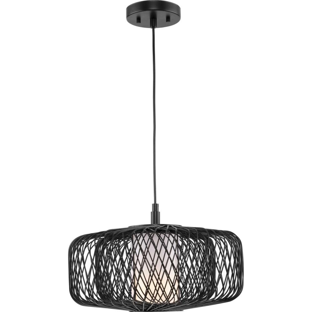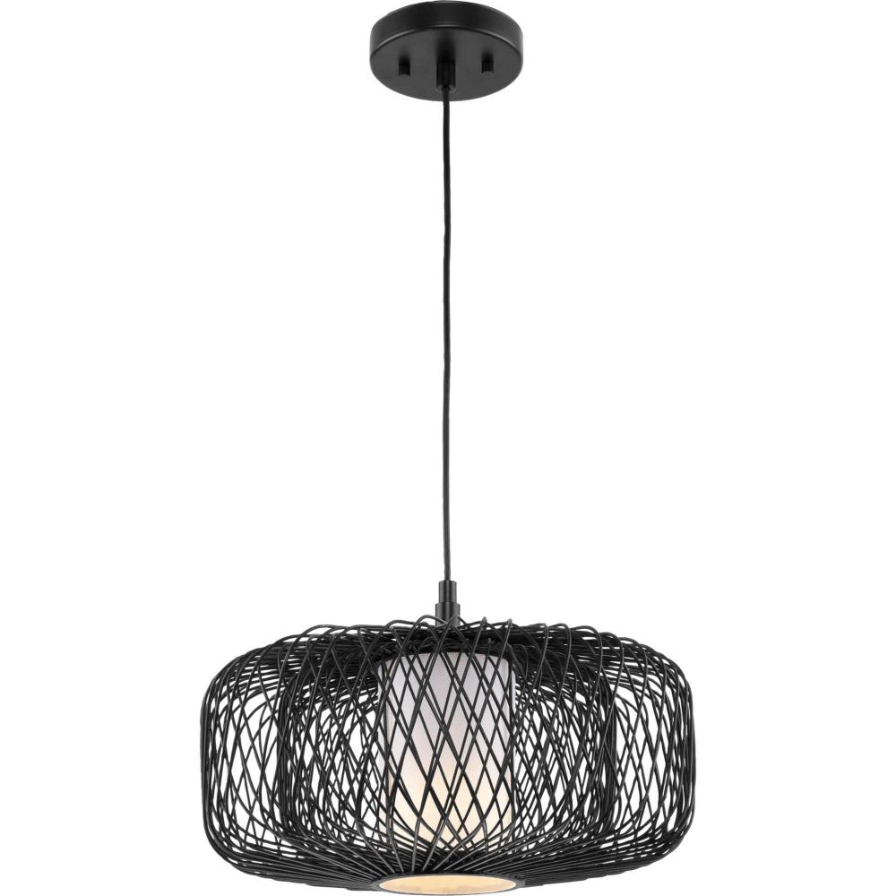 The pendant features a white linen fabric diffuser surrounded by a black rattan shade