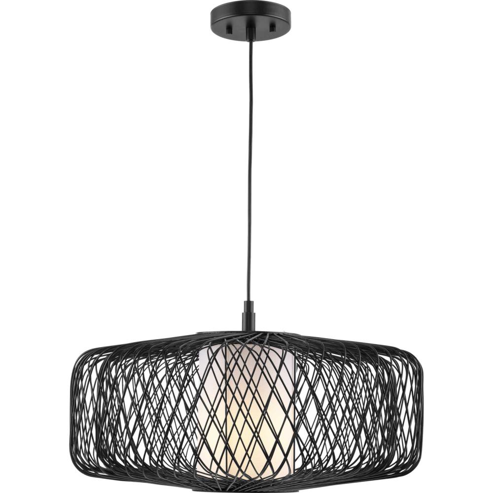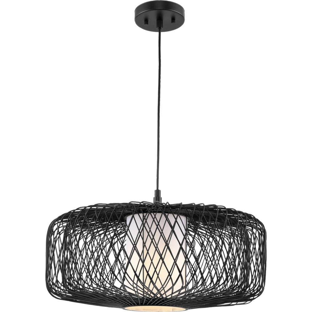 The pendant features a white linen fabric diffuser surrounded by a black rattan shade