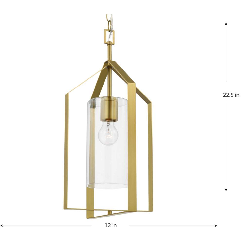 Alluring ambient light is diffused through the fixture's clear cylindrical glass shade and cast through the light's stately frame