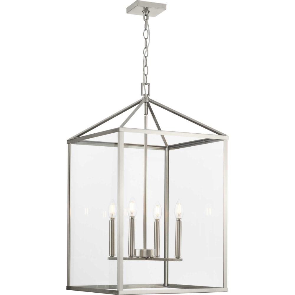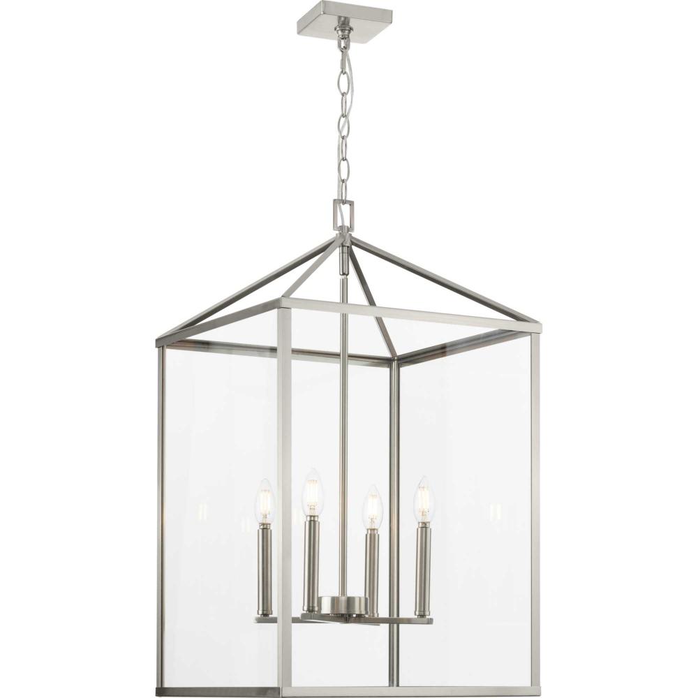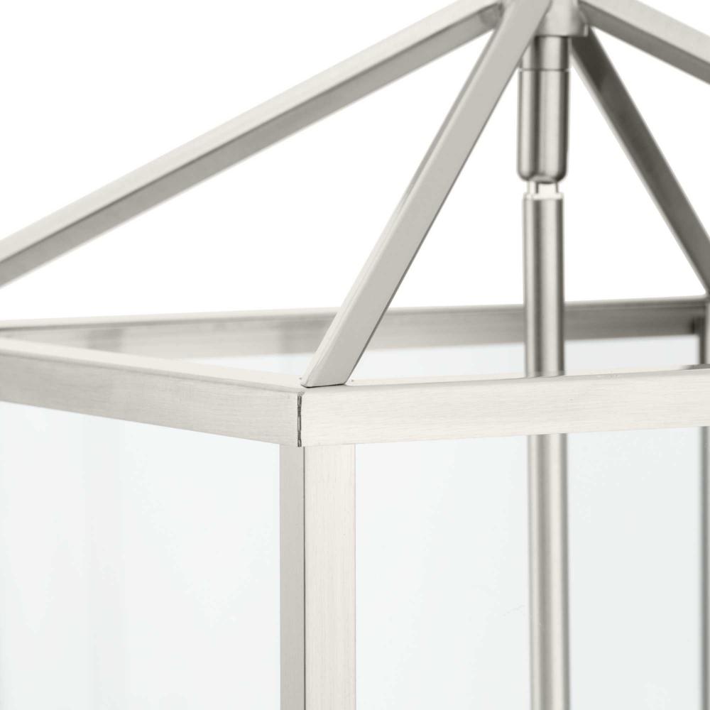 The Hillcrest Foyer Light interprets the traditional carriage light for the modern age, giving it a fresh update with a refined angular silhouette. A classic candelabra base is suspended within a clear beveled glass frame.Clear illumination is cast from its airy design.