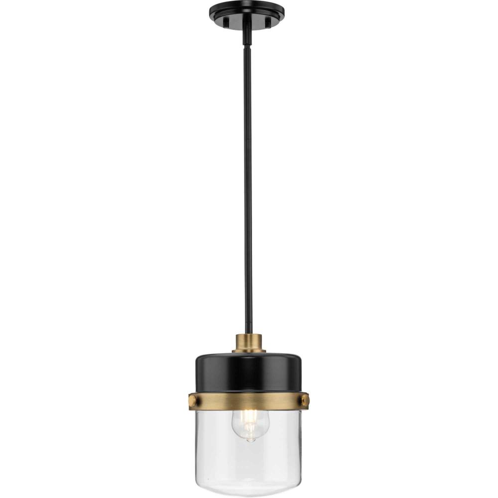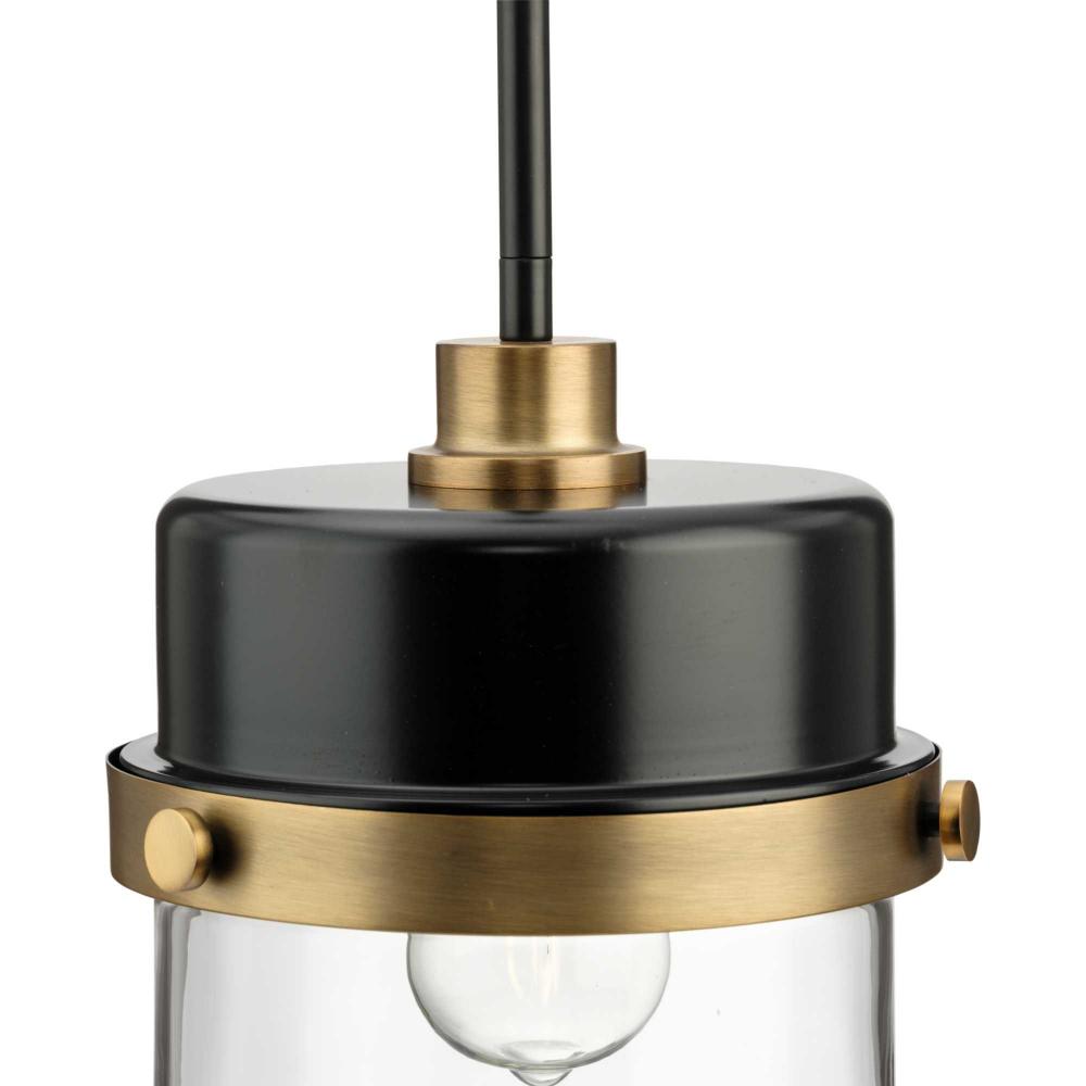 The Beckner Pendant reflects mid-century and industrial design from its mechanical knobs and hooded frame. Finished in Matte Black with Vintage Brass accents, the sleek rod suspends its vintage-style shade complemented by clear glass, delivering bright illumination while adding a modern touch. This mini-pendant can be use in a wide variety of locations.