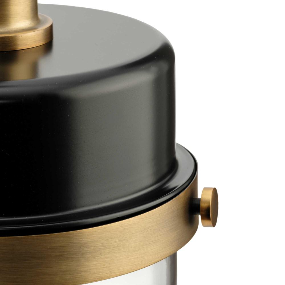 An industrial-style glass shade is suspended from a rod and metal cap coated in matte black with a golden vintage brass accent