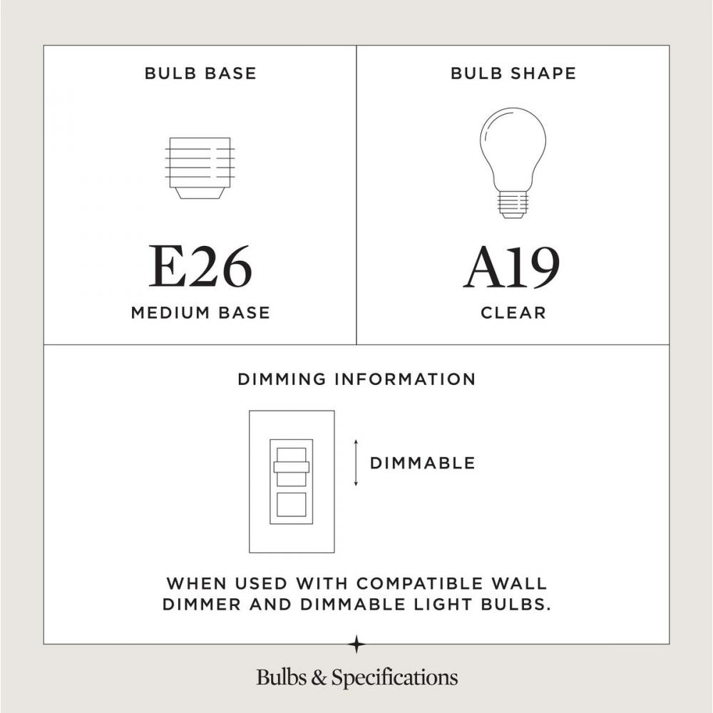 Uses (1) 60-watt max medium base bulb or LED equivalent, that is sold separately, and dimmable when used in conjunction with a dimmable bulb