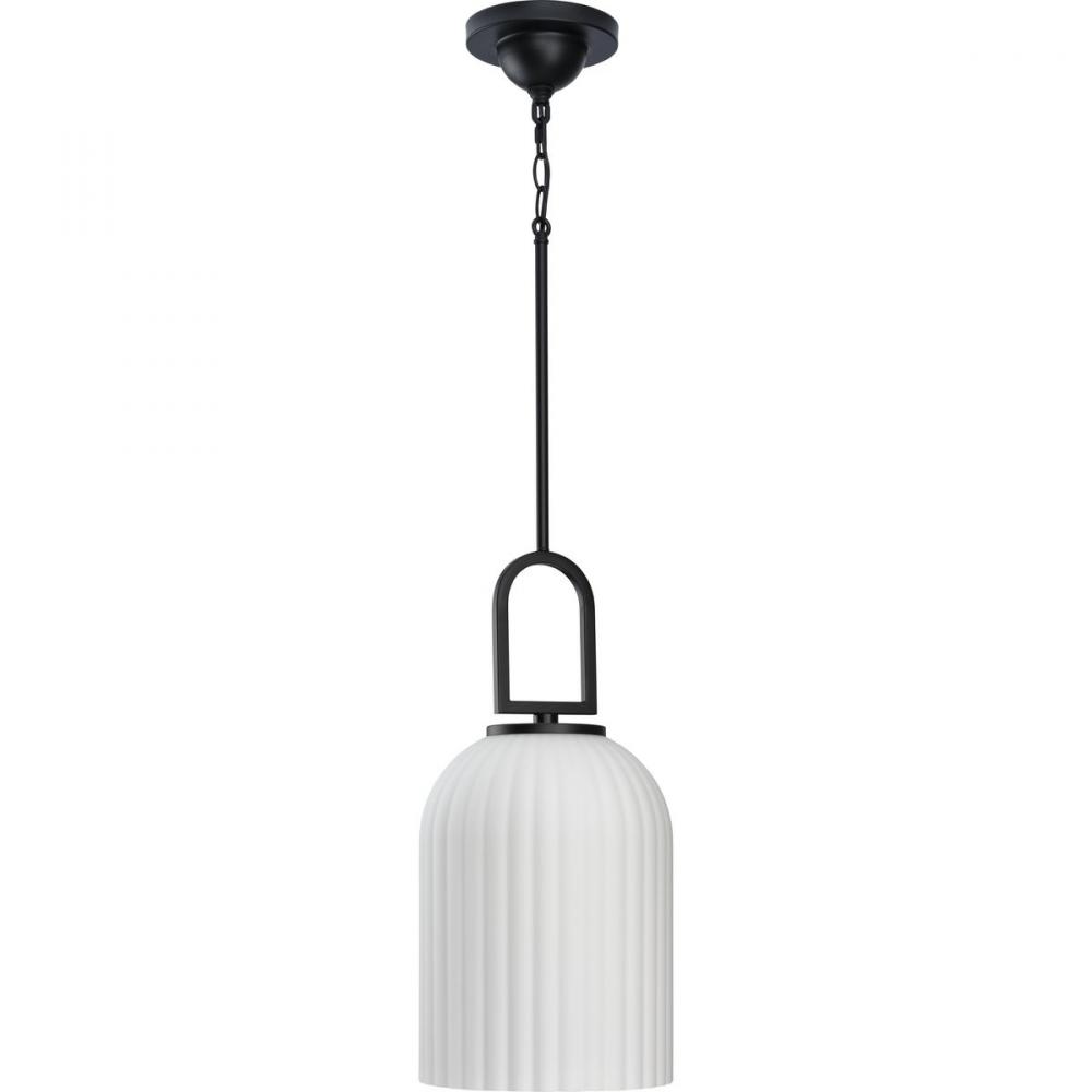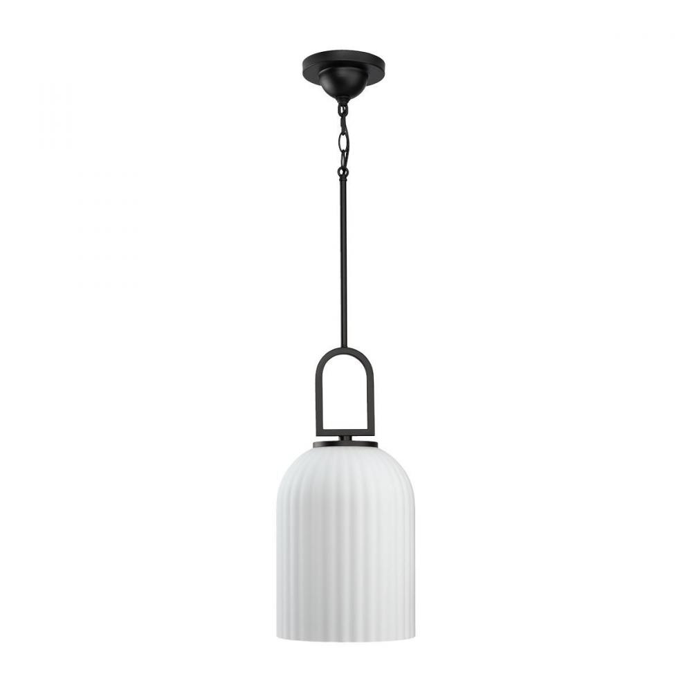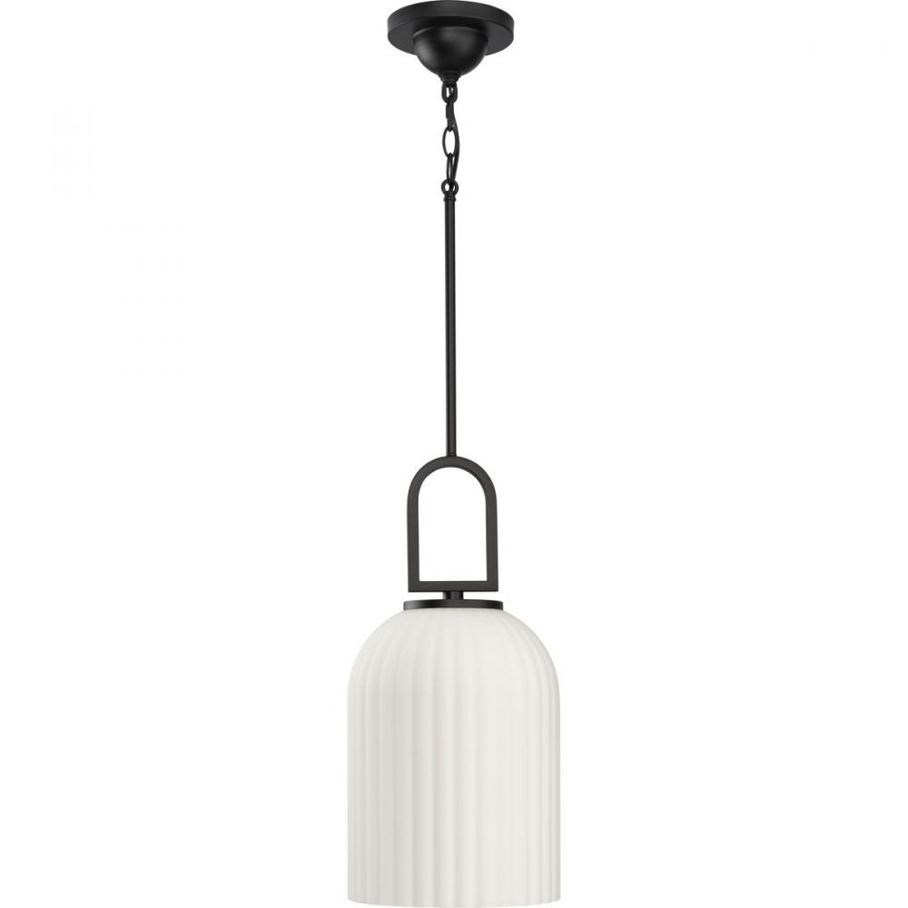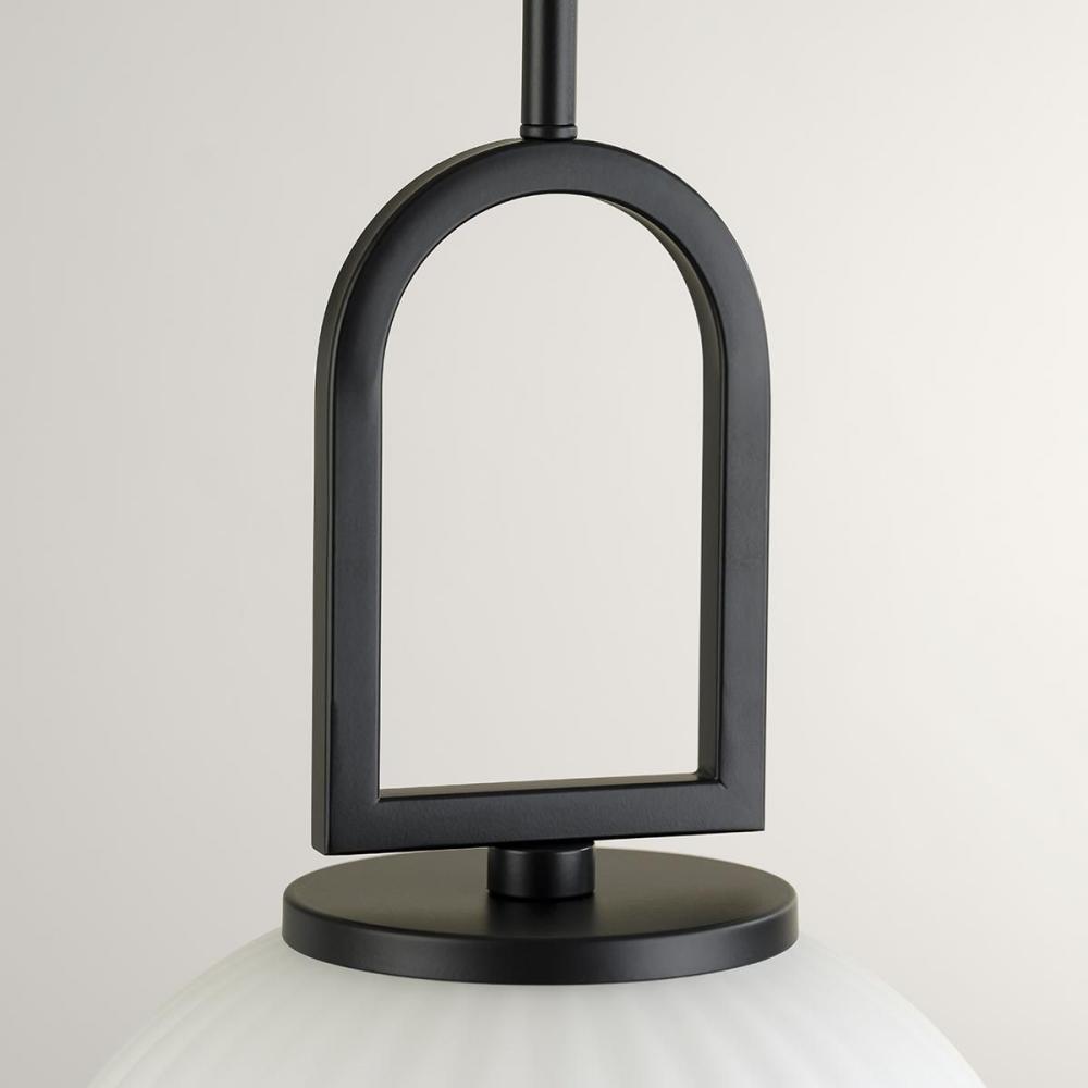 The Stanza Pendant Light merges timeless design with architectural finesse, showcasing a beautifully fluted glass shade with a softly rounded top that evokes vintage charm. Its distinctive arched metal loop, elegantly attached to a streamlined stem and fin