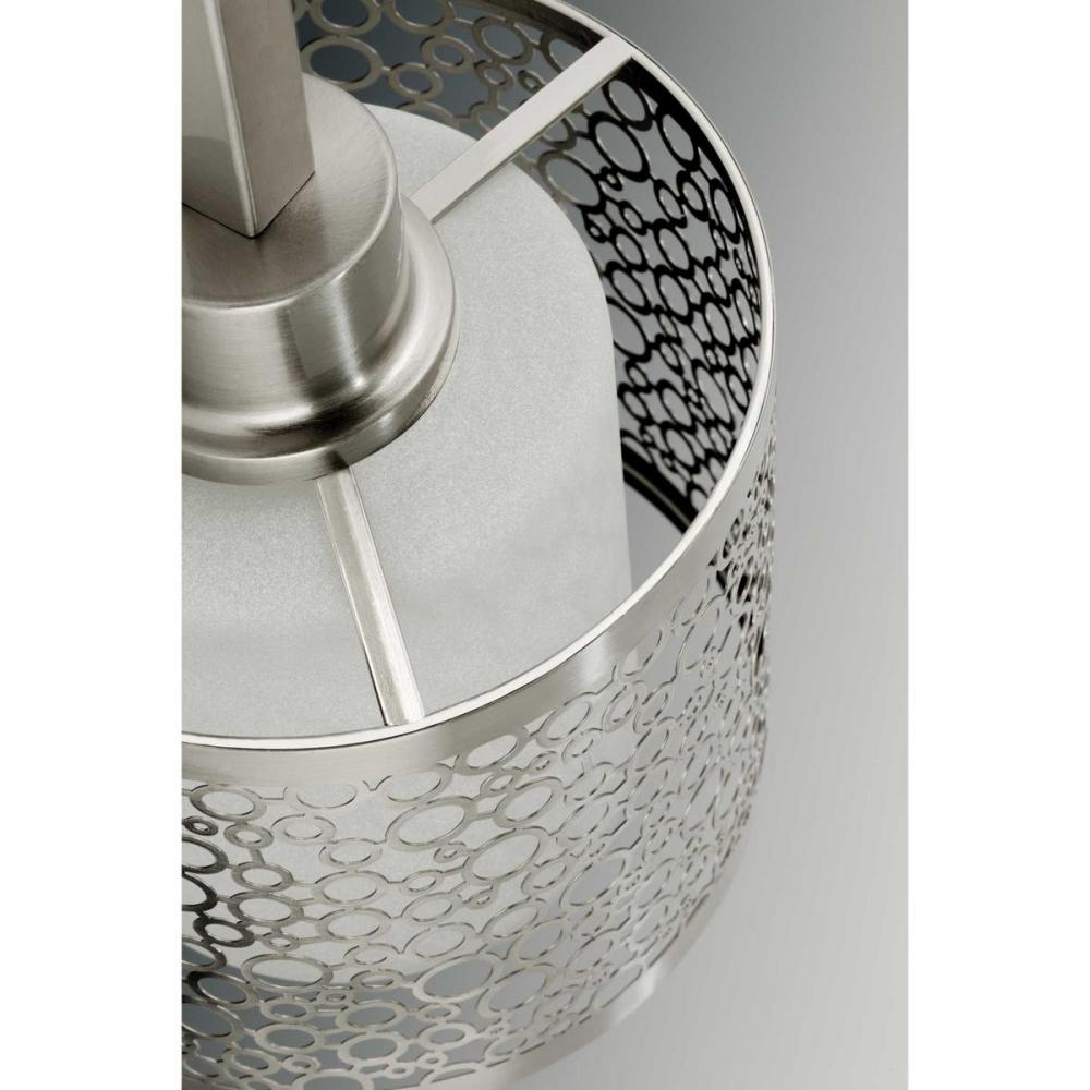 One-light mini-pendant that features a concentric circular pattern in a brushed nickel metal shade that surrounds etched parchment glass.