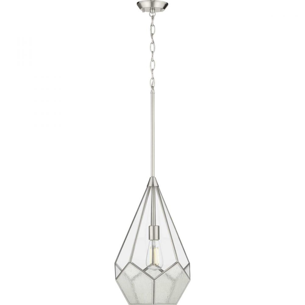 Inspired by modern geometric designs and contrasting elements, this bohemian-style pendant is an attention-grabber for all the right reasons. Geometric shapes form from the brushed nickel frame. Glass panels create a shade that holds an industrial light base inside.