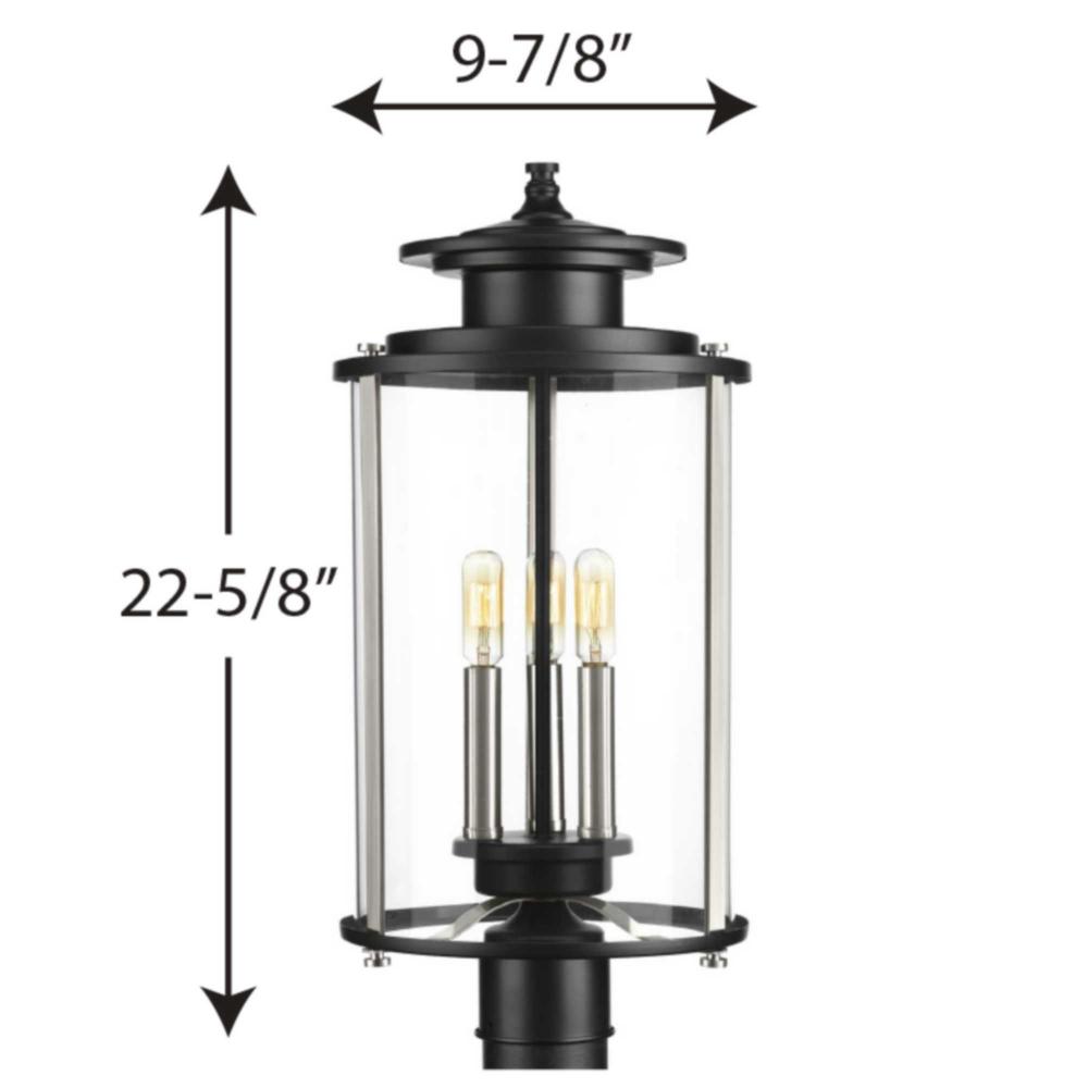 Squire three light post lantern features a classic traditional profile with clean, modern metal fittings. The Black finish is accented with contrasting Stainless Steel metallic elements, the cylindrical frame is comprised of a clear glass diffuser.