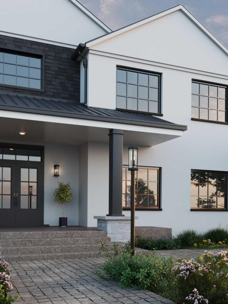 An elongated silhouette adds modern sophistication to the Ramsay Collection, offering elegant curb appeal to new traditional, modern farmhouse and transitional homes. Clear glass panels are outlined by a slender metal frame in a hexagonal shape, bringing dimension to the structure and creating a distinctive design.