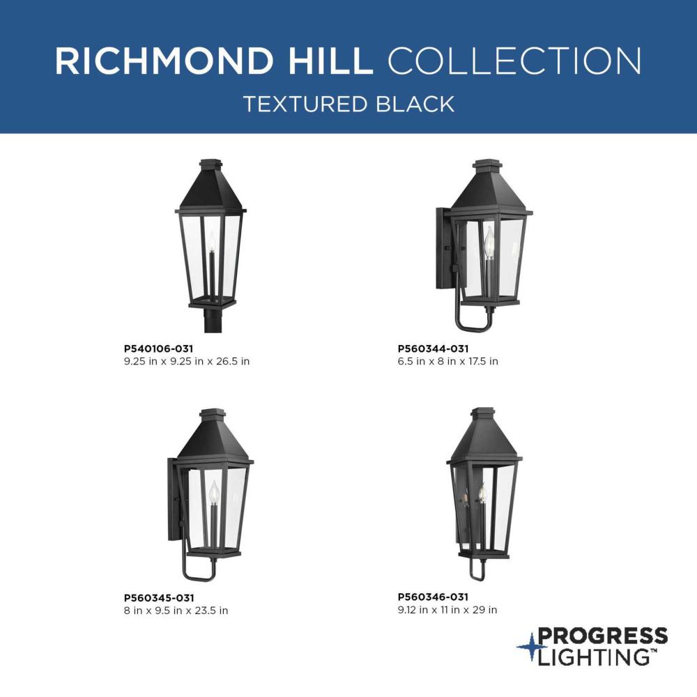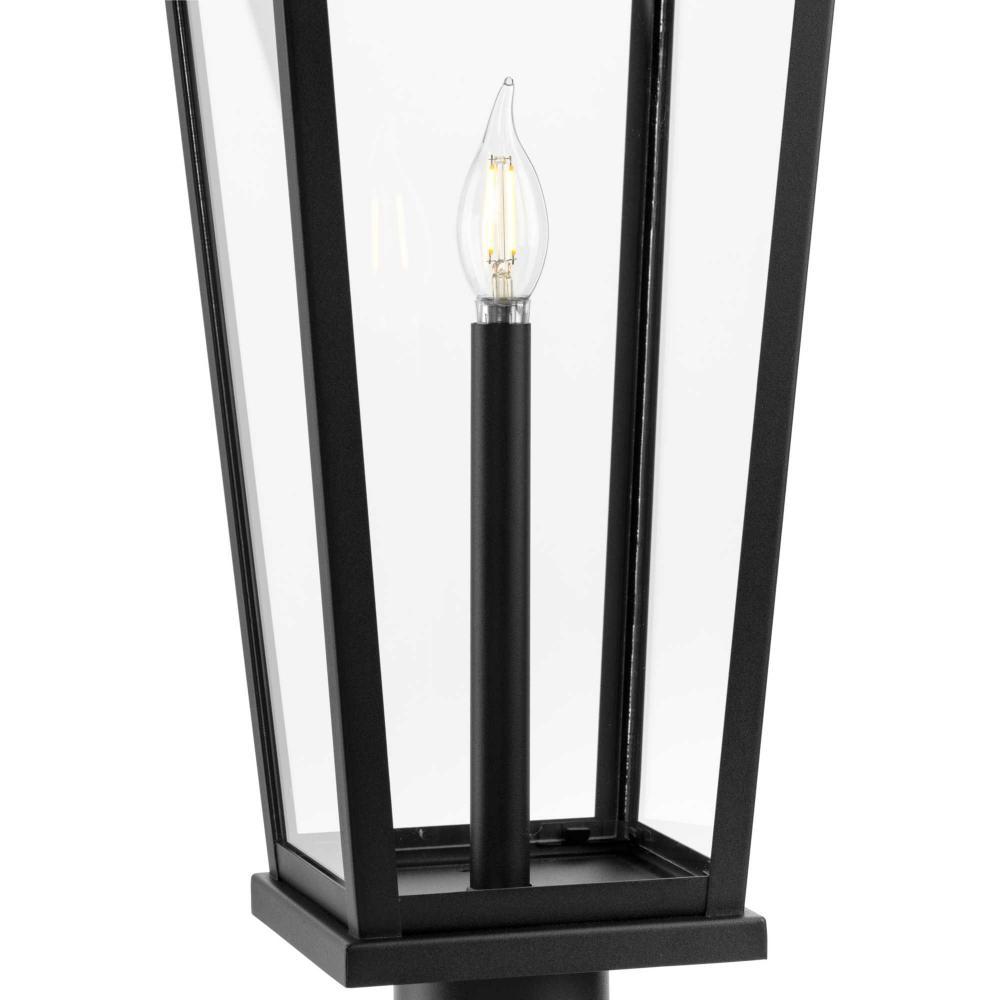 Inspired by vintage glass lanterns, the Richmond Hill Collection has a slender, tall profile and crisp angular details coated in a classic textured black finish. A stately candle enclosed within clear glass panes highlight's the elongated, tapered design while delivering crisp illumination. The updated traditional design of thispost light offers fresh style to the landscapes of modern farmhouse and transitional homes. Mount this light on a 3" standard post (sold separately). It is cULus wet location listed for use where water may be present, with a one-year warranty to guarantee your complete satisfaction. Progress Lighting products are designed for exceptional quality, reliability, and functionality.