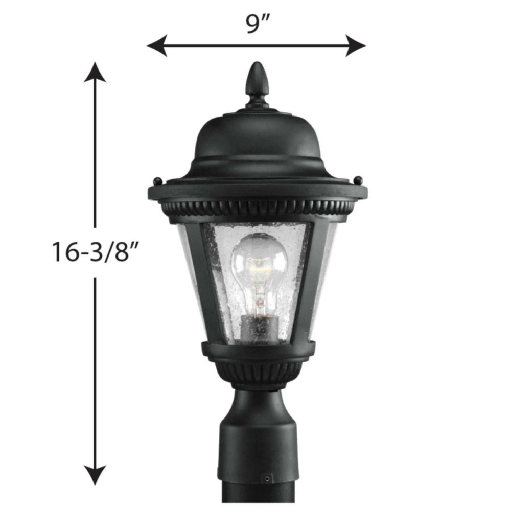 Add a touch of rustic appeal and classic styling with beaded detailing in the Westport collection. Clear seeded glass compliments the durable powder coat finish in die-cast aluminum frames. One-light 9" post lantern. Textured Black finish.