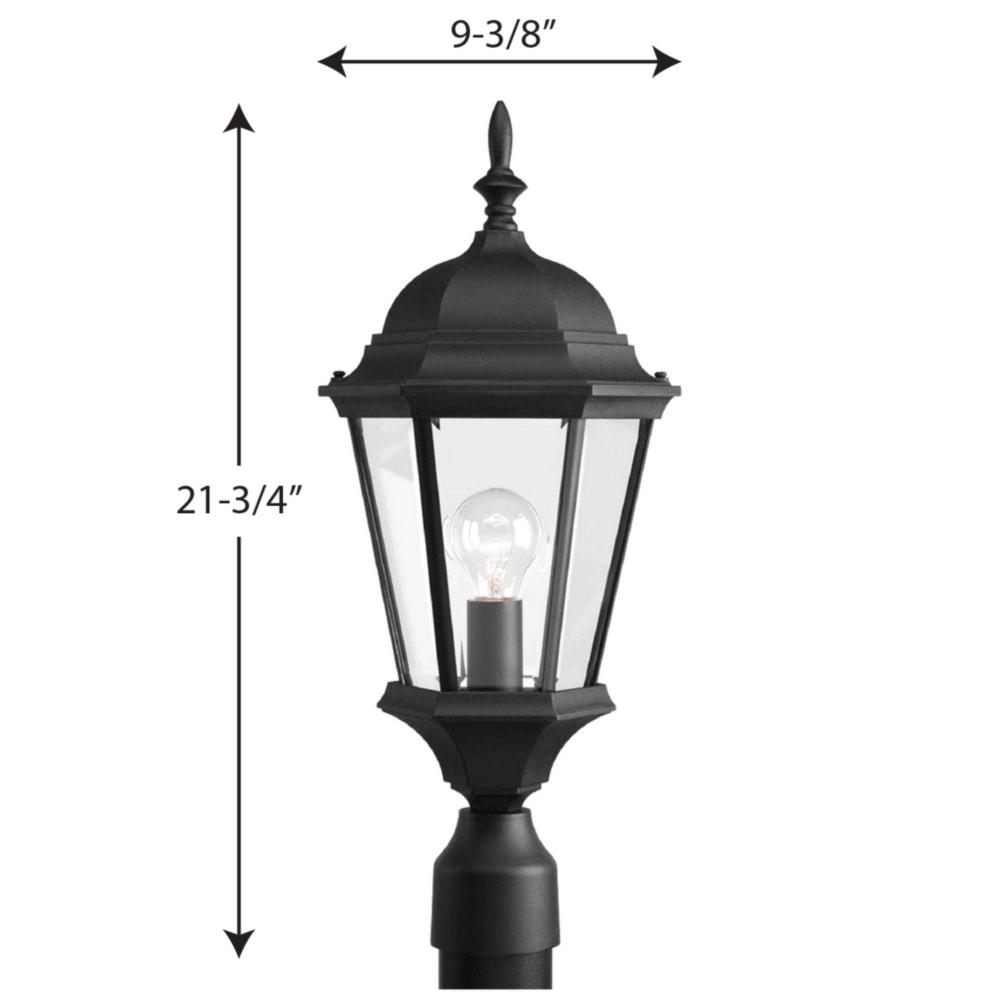 The Welbourne collection features hexagonal framework with vine inspired scrolls and clear beveled glass panels. Cast aluminum construction with durable powder coat finish. One-light post lantern. Textured Black finish.