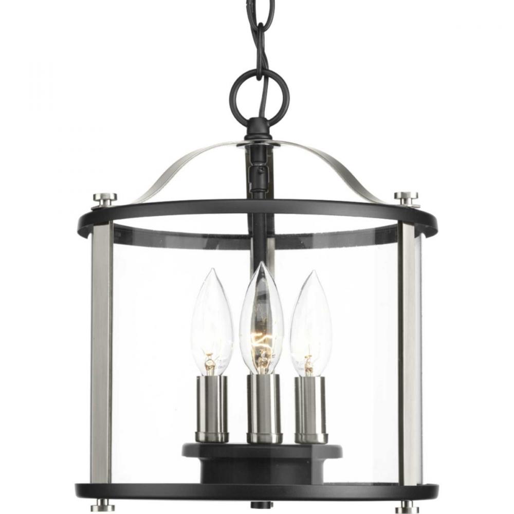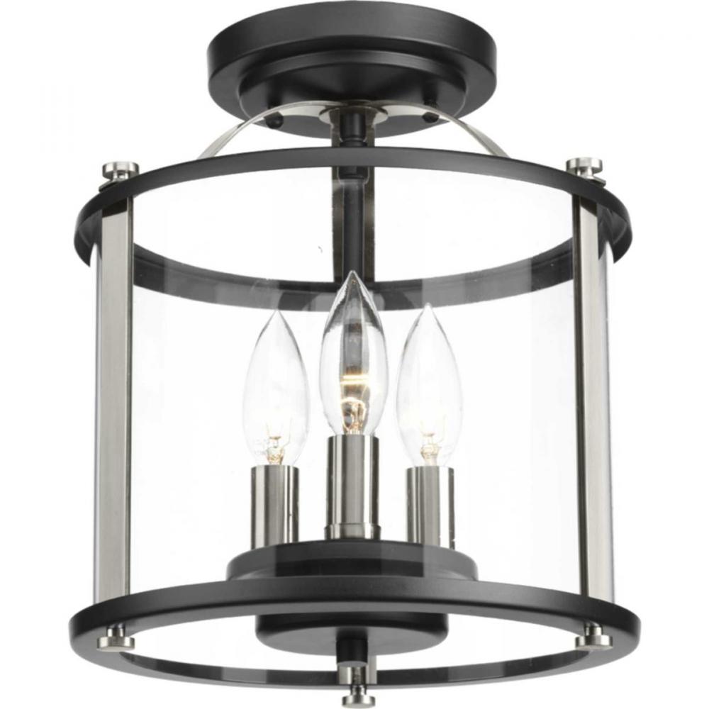 Squire three light semi-flush convertible lantern features a classic traditional profile with clean, modern metal fittings. The Black finish is accented with contrasting Stainless Steel metallic elements, the cylindrical frame is comprised of a clear glass diffuser.