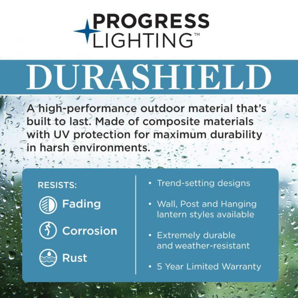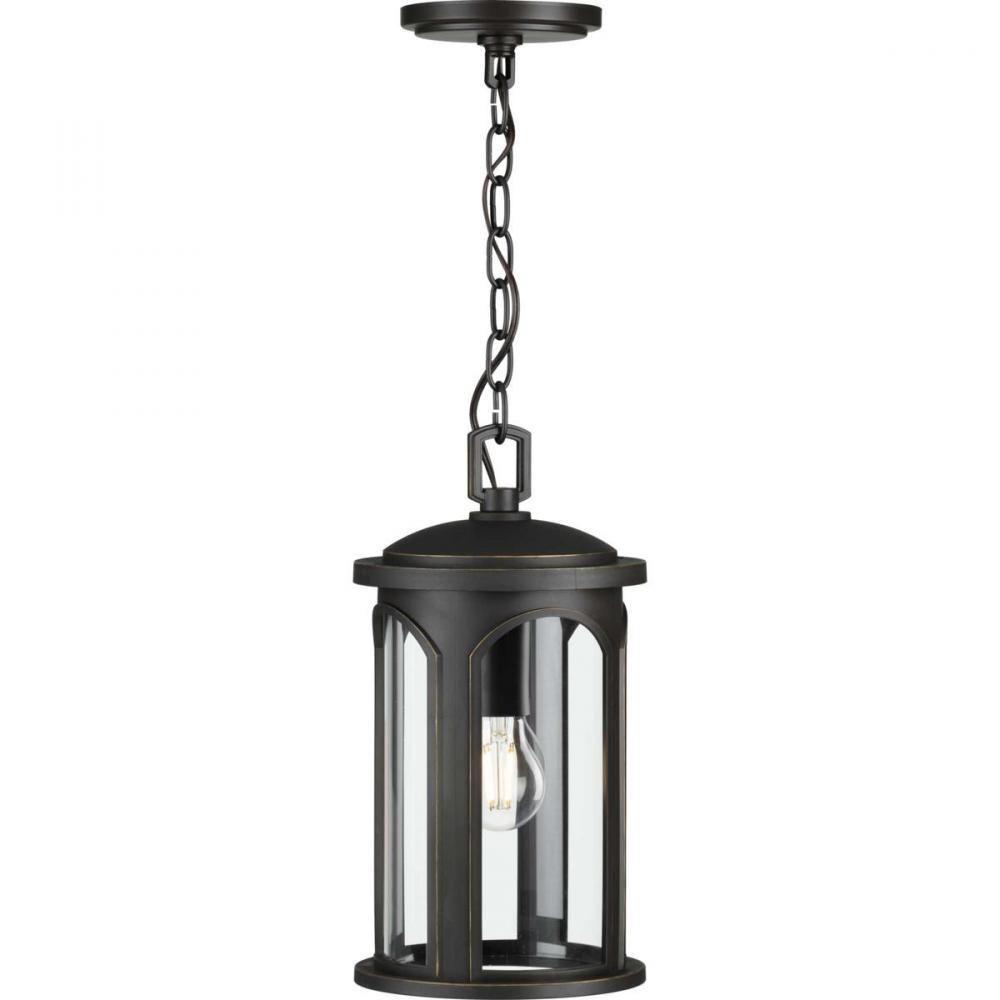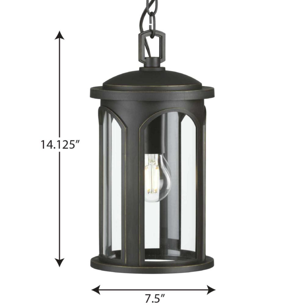 Elevate your home decor with the graceful arches of the Gables Collection 1-Light Antique Bronze Glass Traditional Outdoor Hanging Lantern Light. The lantern's stately frame with airy archways is coated in a handsome antique bronze frame. A light source glows from within the clear glass shade. The hanging lantern is constructed from DURASHIELD, an engineered polymer developed by Progress Lighting to help withstand a broad range of environmental conditions.
