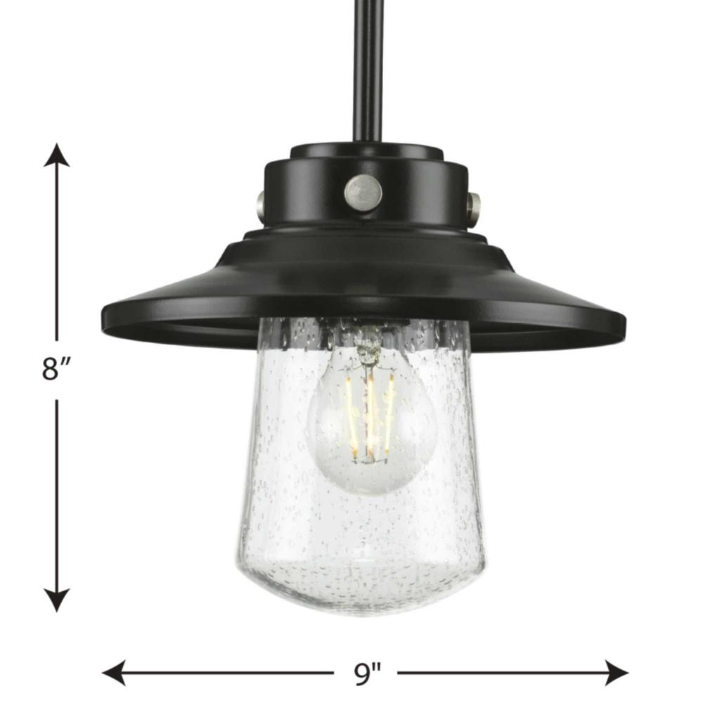 Welcome family and friends home with the Tremont Collection 1-Light Matte Black Clear Seeded Glass Farmhouse Outdoor Hanging Mini-Pendant Light. Mechanical stainless-steel fittings and a smooth stem coated in a classic matte black finish offer industrial detail to the design. A seeded glass shade fosters a tailor-made rustic look.