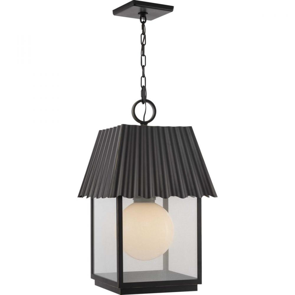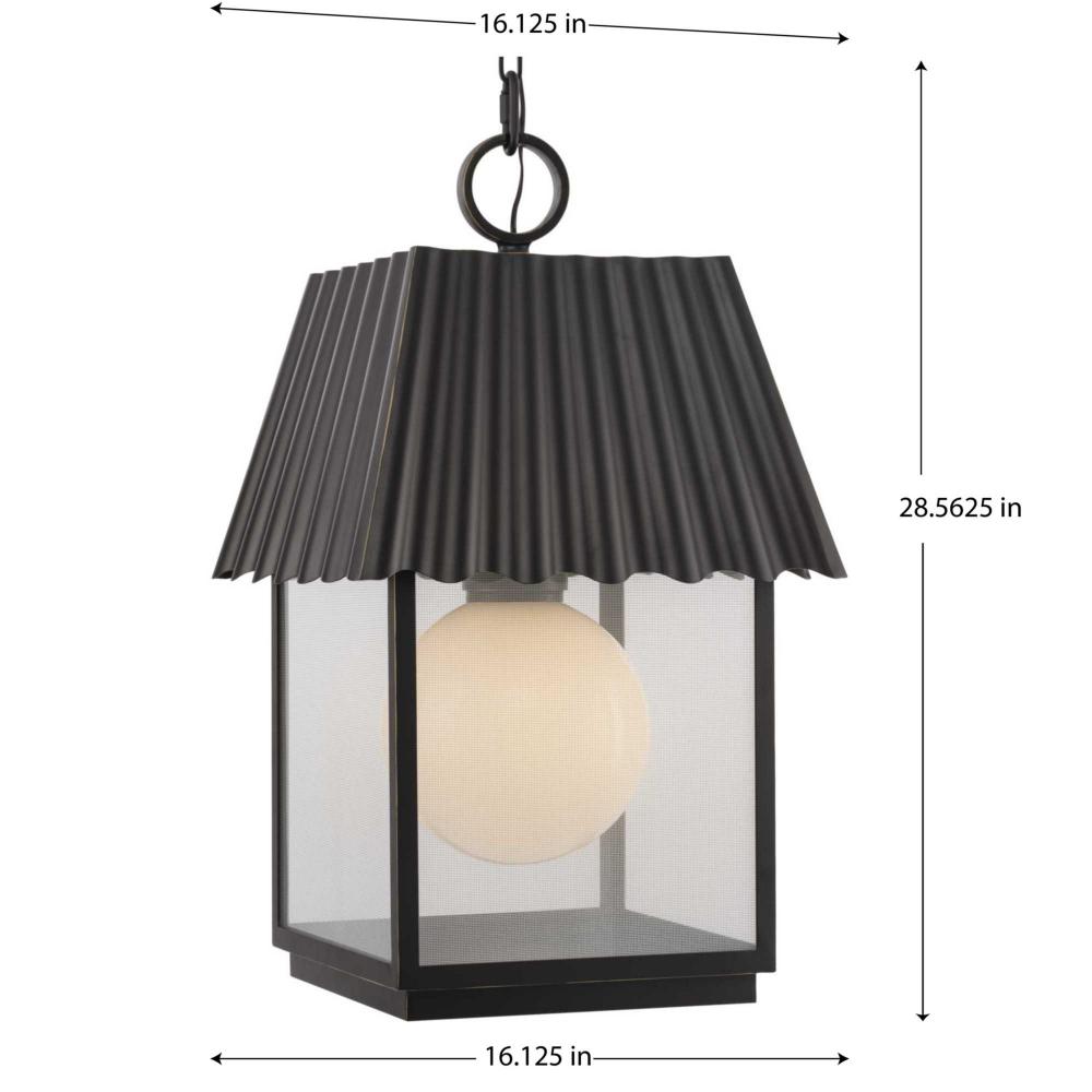 Evoking thoughts of Jeffrey Alan Marks' East Coast summer home, the Hook Pond Collection features a steeply pitched, barn-inspired roof crowned with a distinctive loop finial. A clean, modern frame holds glass panels printed with a unique silver mesh pattern reminiscent of a traditional screened-in porch. Light is comfortably diffused from the white opal glass orb held within the generously scaled frame. Constructed of corrosion-resistant DURASHIELD, engineered composite polymers that withstands a broad range of environmental conditions, delivering beautiful lighting and reliability. This family of fixtures is part of the Jeffrey Alan Marks Point Dume lighting collection which celebrates a curated mix of yesterday and today, distilling both industrial and artisanal influences.