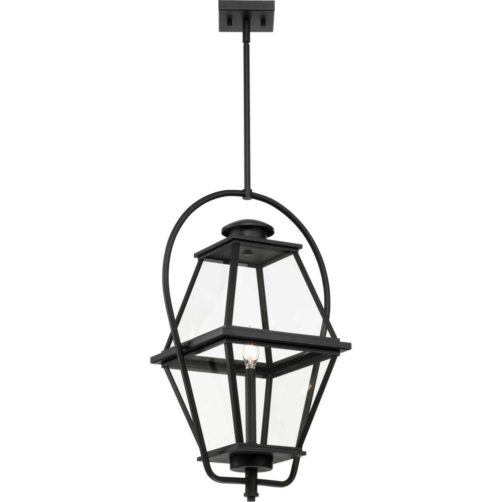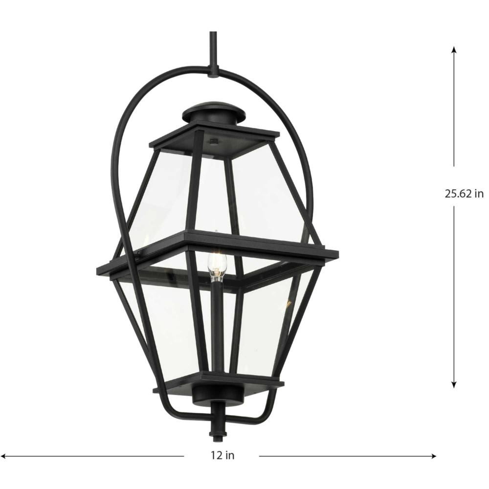 The Bradshaw Collection nods to historical style with its traditional lantern design, beautifully updating a homes curb appeal. A comforting glow is diffused through clear glass panes, creating a warm and romantic ambiance.The gracious lines of this hanging lantern, finished in classic textured black, elegantly complement exteriors of traditional, transitional and farmhouse settings. It is cULus damp location listed for use where water may be present, with a one-year warranty to guarantee your complete satisfaction. This versatile design includes one 6", four 12" stems and a 90-degree swivel for a variety of mounting types and sloped ceiling applications. Progress Lighting products are designed for exceptional quality, reliability, and functionality.