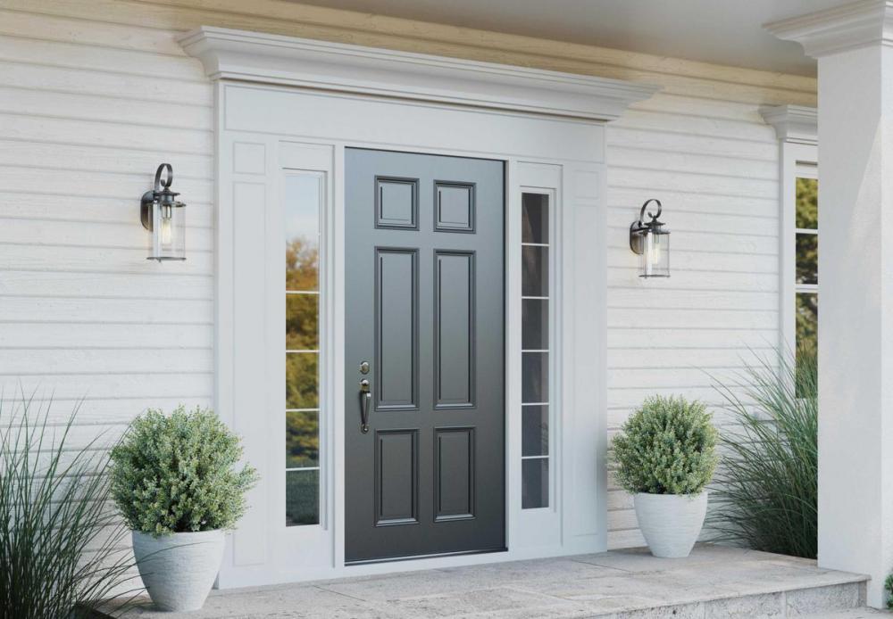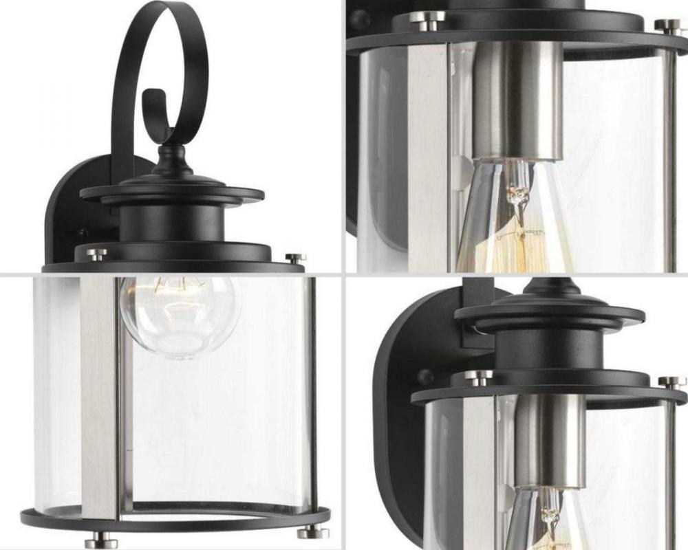 Profile features clean, modern metal fittings;Lantern is accented with contrasting metallic elements;A cylindrical frame is comprised of a clear glass diffuser;Black finish with Stainless Steel accents.