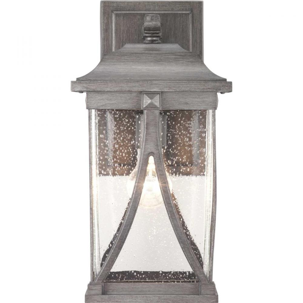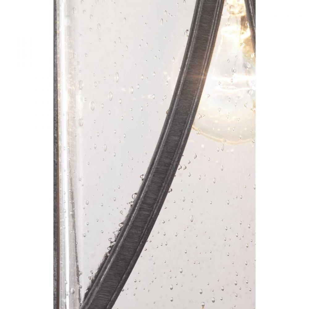 Distinctive forms with ancient roots are featured in this medium wall lantern from the Abbott Collection. Transparency, depth and dimension are all on display to highlight the clear seeded glass and sweeping details within the Antique Pewter frame.