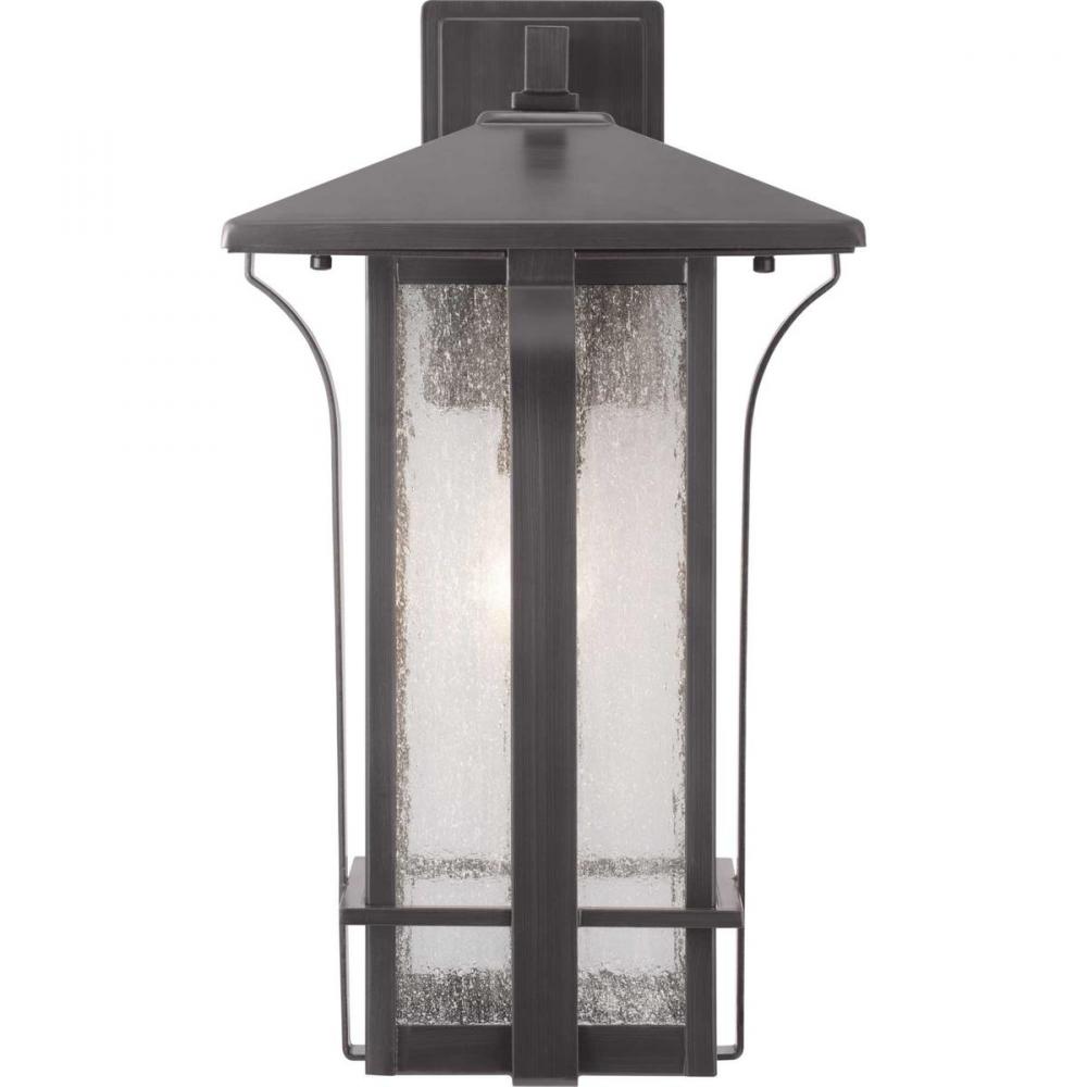The Cullman Collection outdoor small wall lantern delivers dramatic scale with Craftsman appeal. Bold and linear details in an Antique Bronze finish highlight clear seeded glass. Ideal for spacious Modern architecture settings.