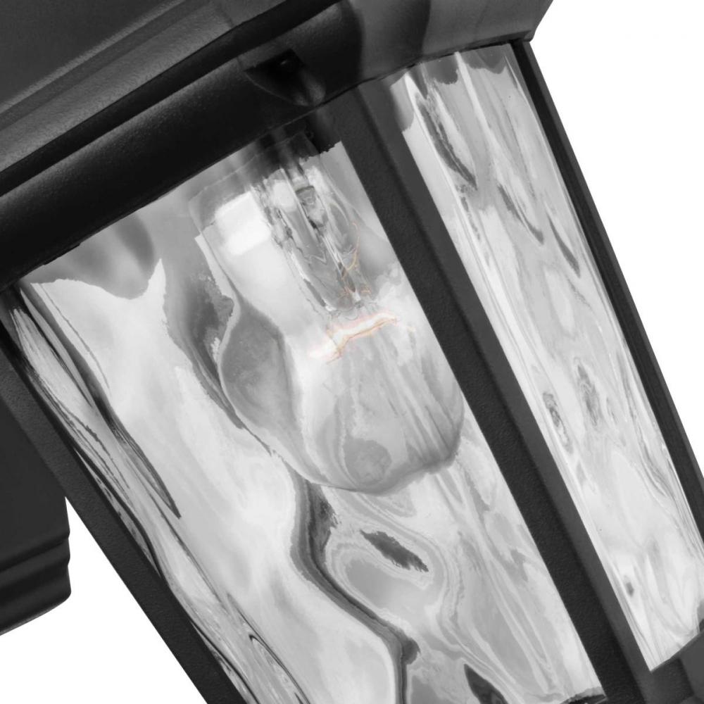 This wall lantern is a go-to choice when incorporating classic silhouettes with a farmhouse flair into your home décor vision. The traditional frame is constructed with non-metallic, corrosion-resistant composite polymer in a classic black finish. A beautiful water glass shade adds charming character to the timeless design. DURASHIELD by Progress Lighting is built to last. Constructed from a composite material with UV protection, DURASHIELD holds up even in the harshest weather conditions. This high-performance finish has a 5-year warranty and is resistant to rust, corrosion, and fading.