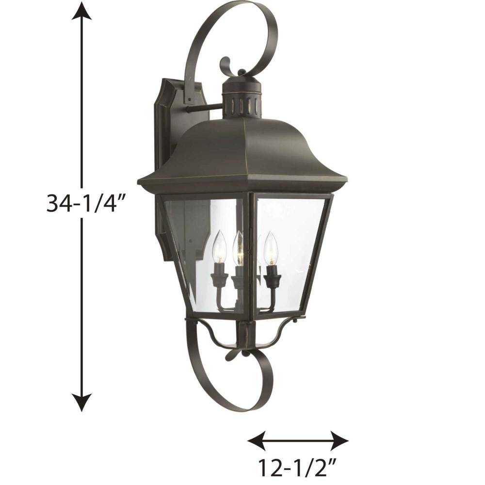 The Andover collection four-light extra-large wall lantern with aluminum construction, offers a mixture of traditional and country style for a variety of applications. Beveled glass panels allow optimum brightness. Hinged door for easy relamping.