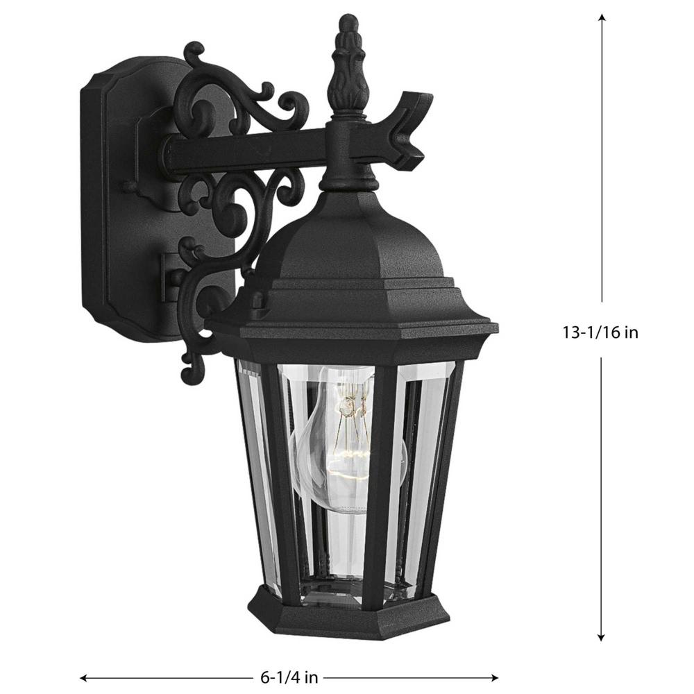 The Welbourne collection features hexagonal framework with vine inspired scrolls and clear beveled glass panels. Cast aluminum construction with durable powder coat finish. One-light 6-1/2" top mount outdoor wall lantern.