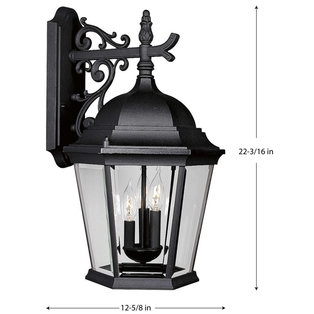 The Welbourne collection features hexagonal framework with vine inspired scrolls and clear beveled glass panels. Cast aluminum construction with durable powder coat finish. Three-light wall lantern.