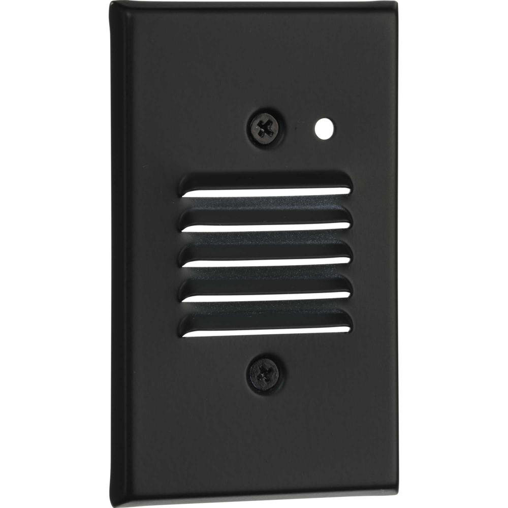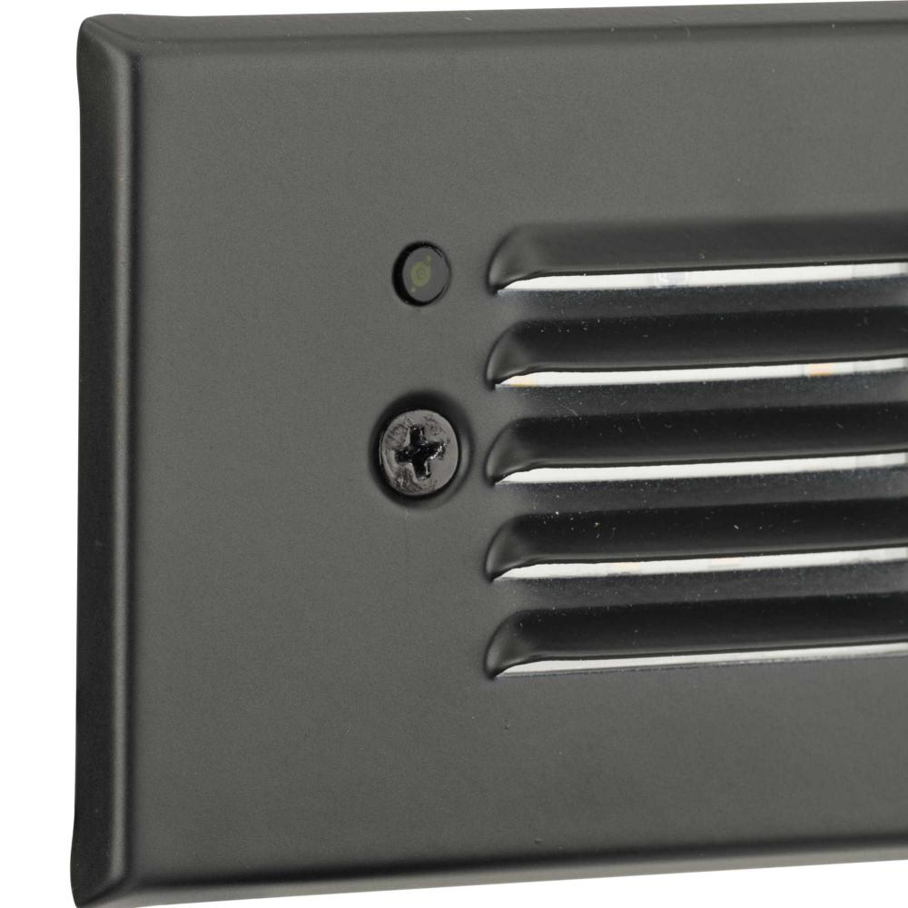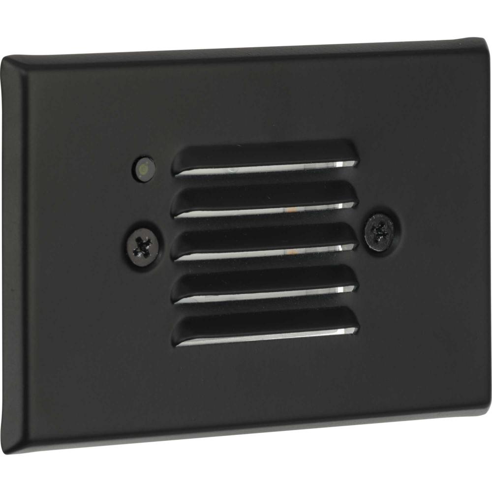 The LED Step/Wall Light finished in classic black offers an elevated look to exterior architectural styles, whether residential or commercial. A horizontal and a vertical exterior face plate are provided to accommodate either a horizontally or vertically oriented installation. The step light features an integrated photocell with automatic dusk to dawn operation, automatically turning the fixture on and off at sunset and sunrise, eliminating the need for additional controls. The photocell and LED assembly is enclosed in a gasketed lens, allowing it to meet the rigorous demands of wet location use. The louvered face plates direct the light downwards to minimize glare and clearly illuminate stairs, walls, and walkways, resulting in performance, cost and safety benefits. It is cCSAus wet location rated for use in areas with direct water contact. .