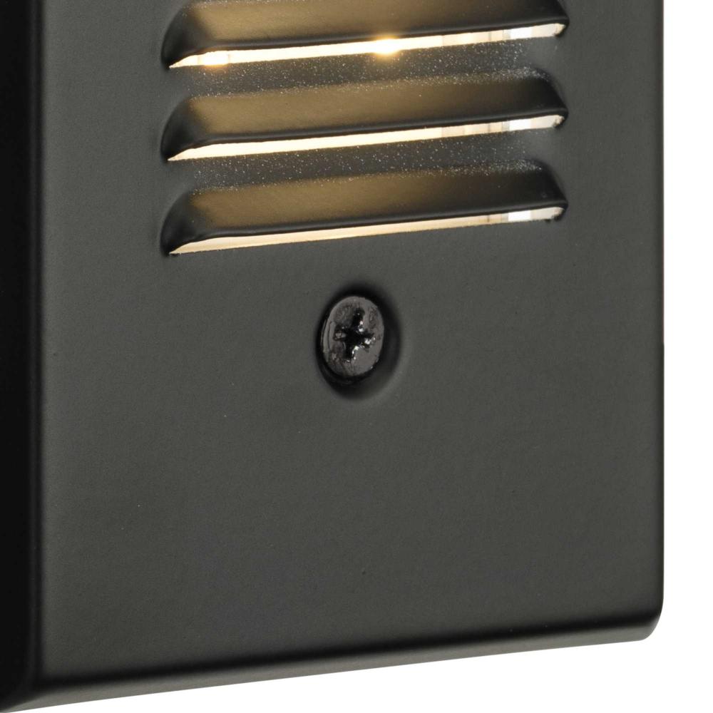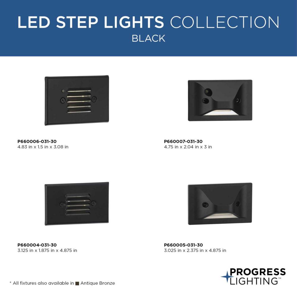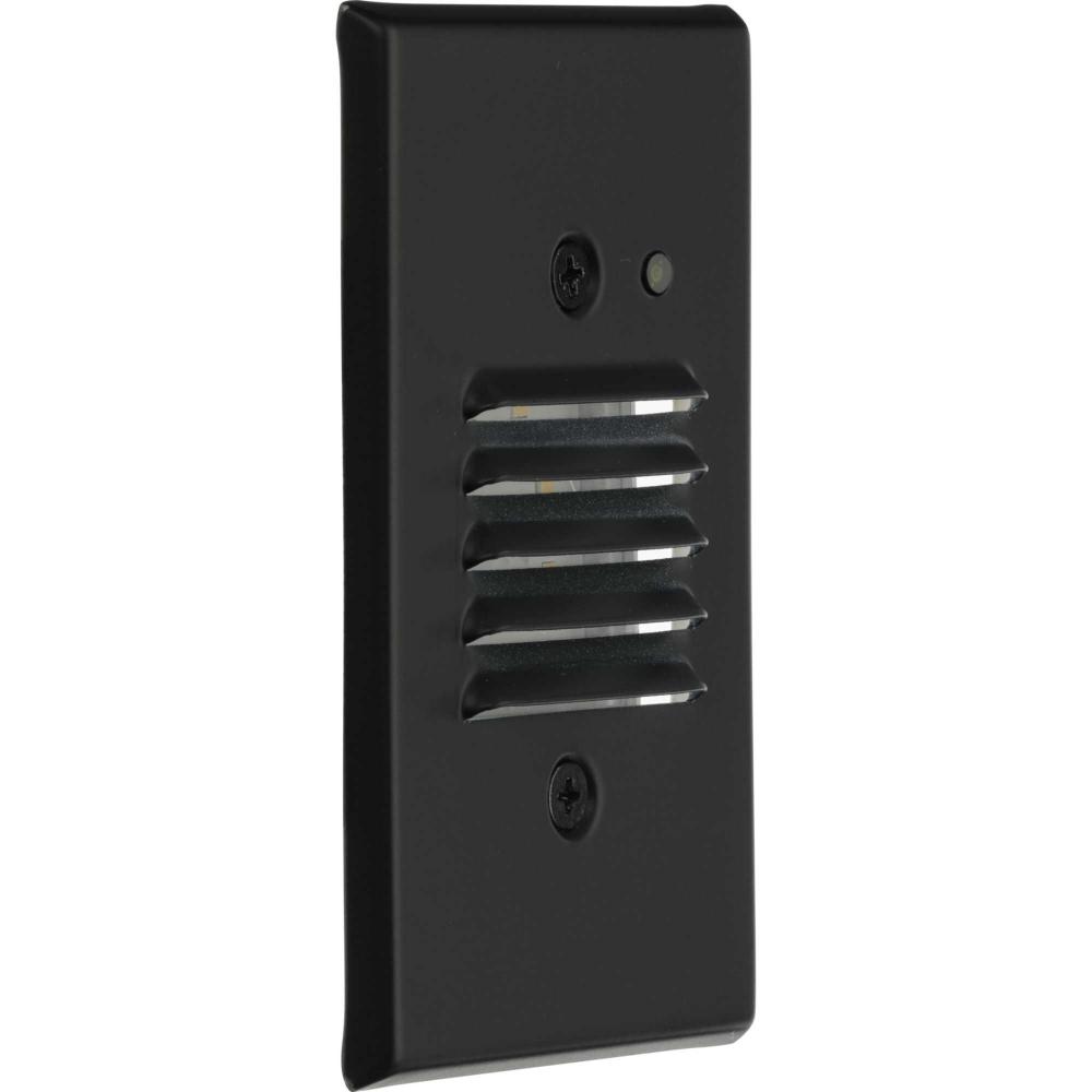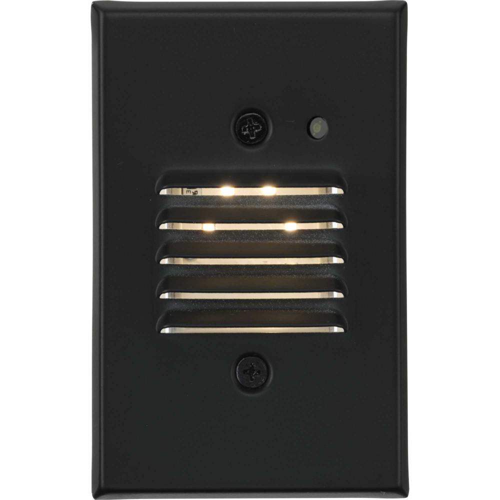 The LED Step/Wall Light finished in classic black offers an elevated look to exterior architectural styles, whether residential or commercial. A horizontal and a vertical exterior face plate are provided to accommodate either a horizontally or vertically oriented installation. The step light features an integrated photocell with automatic dusk to dawn operation, automatically turning the fixture on and off at sunset and sunrise, eliminating the need for additional controls. The photocell and LED assembly is enclosed in a gasketed lens, allowing it to meet the rigorous demands of wet location use. The louvered face plates direct the light downwards to minimize glare and clearly illuminate stairs, walls, and walkways, resulting in performance, cost and safety benefits. It is cCSAus wet location rated for use in areas with direct water contact. .