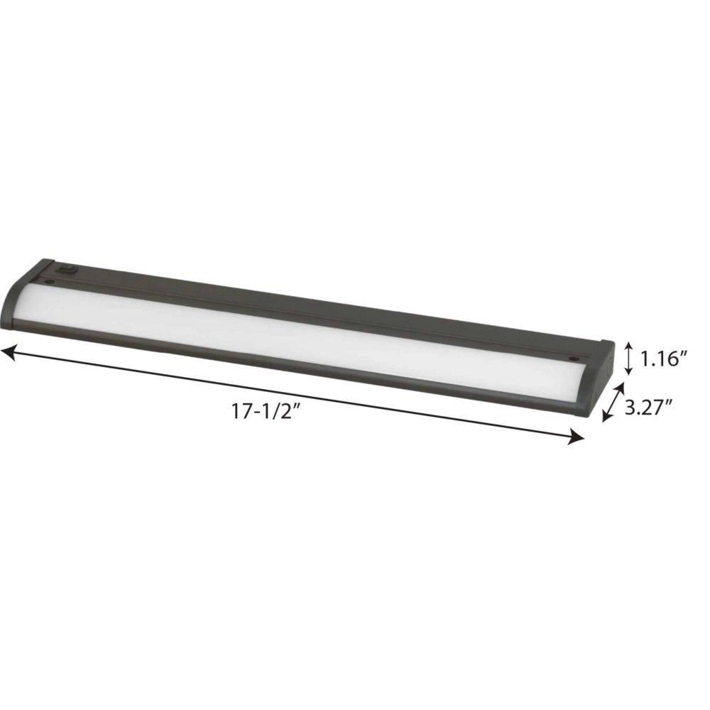 18" linear undercabinet fixture;Antique Bronze powder coat finish;Extruded aluminum construction;Angled lens design to ensure proper illumination;Integral ON/OFF switch;Dimmable to 10% with many Forward Phase (Triac) or Electronic Low Voltage (ELV) dim