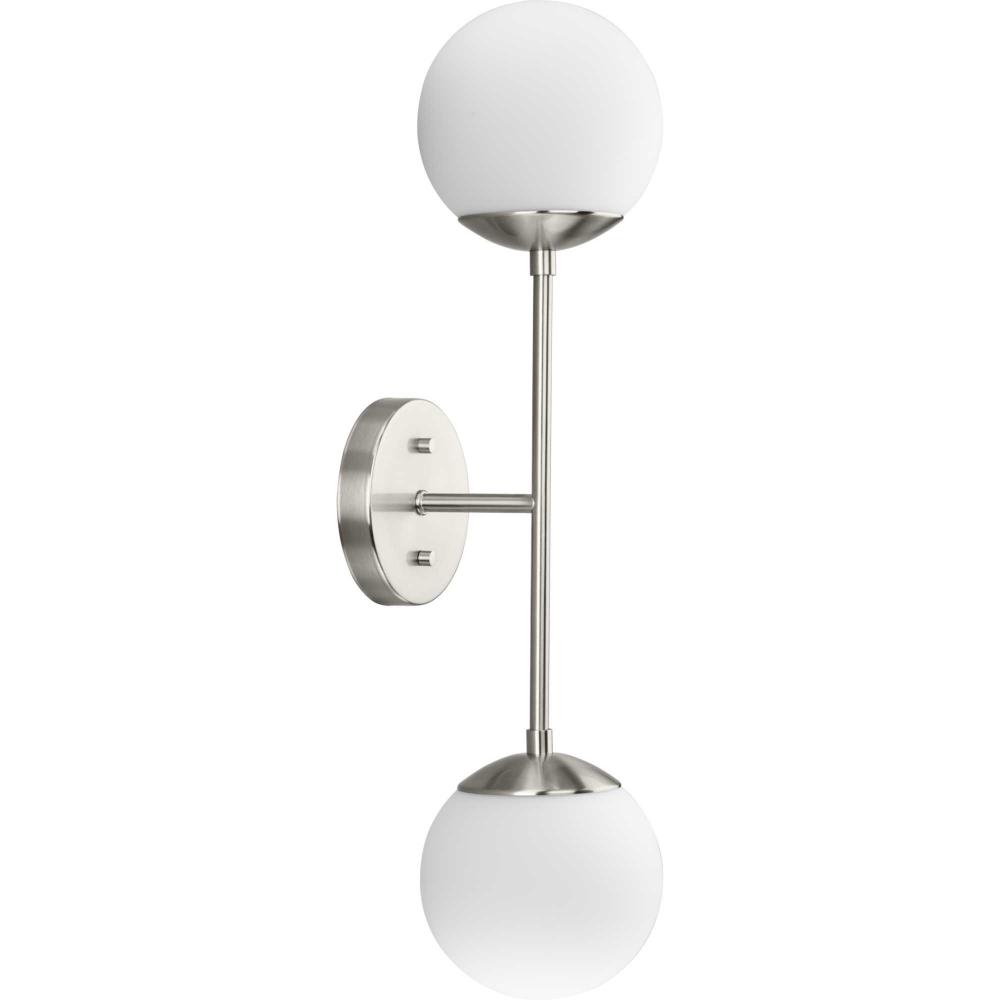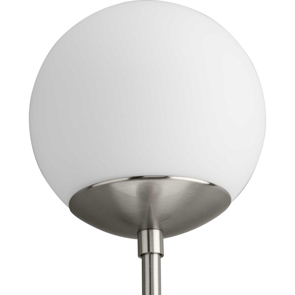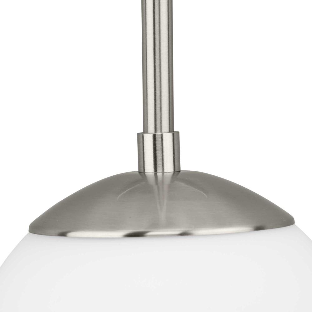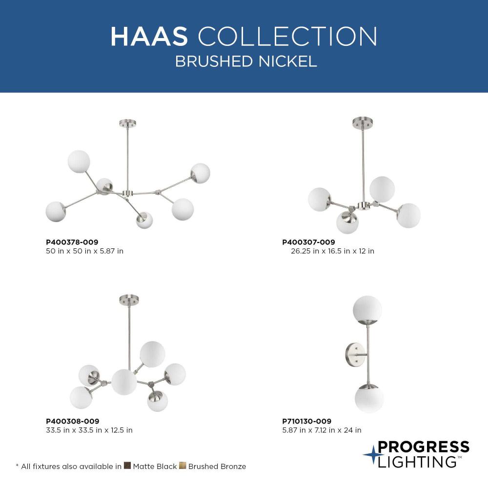 Modern and organic inspirations elegantly meld together in Haas. A bold linear frame finished in Brushed Nickel branches out to embrace smoothly etched opal glass globes that imbue rooms with soft illumination, and fits beautifully into timeless modern, mid-century modern and contemporary settings. This fixture is part of the Progress Lighting Design Series, a lighting collection offering fashionable styles and luxury lighting for the home.
