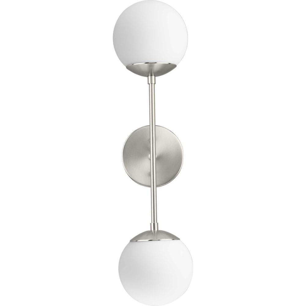 The wall bracket complements dining rooms, great rooms and bedrooms with its etched opal glass globes and bold linear lines