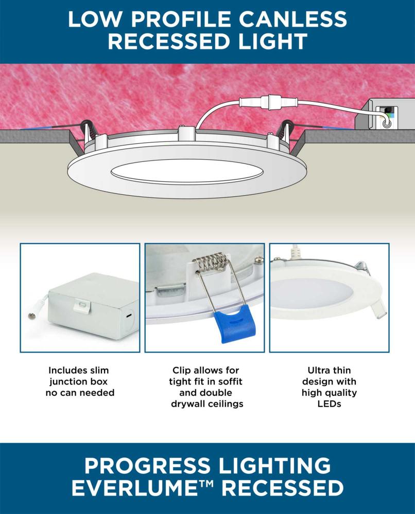 With a slim profile and the latest LED technology, the 6-inch Everlume Recessed Downlight offers smooth, even 3000K illumination to homes and commercial spaces. Its edge-lit surface delivers low glare, 12W, 950 lumen light without dark spots from a polycarbonate lens and is dimmable using ELV or TRIAC dimmers. Its aluminum trim is finished in crisp Satin White that blends quietly into its surroundings. A detached J-Box, provided with quick connects, eliminates the need for an additional recessed housing. The trim features a gasket to close off the ceiling opening. Additionally, spring clips ensure a secure flush mount to the ceiling surface. Everlume recessed LED is easily installed into 6-inch openings in low clearance, new construction and remodel, ceiling applications. This versatile downlight is JA8-2019 Title 24 Rated, and cETLus Wet Listed for use in areas where water may be present.