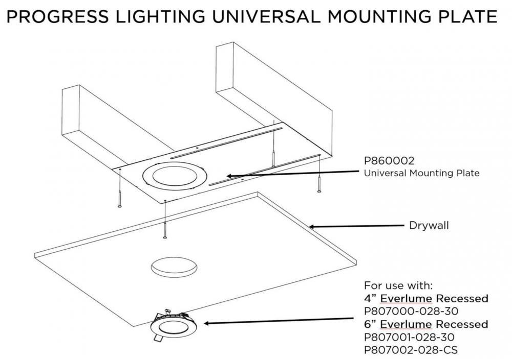 The Universal Installation Mounting Plate Accessory accommodates 4- and 6-inch Progress Everlume® recessed LED downlights in new construction projects. Crafted of corrosion resistant galvanized steel, the adjustable design features slotted mounting holes for locating the installation hole.