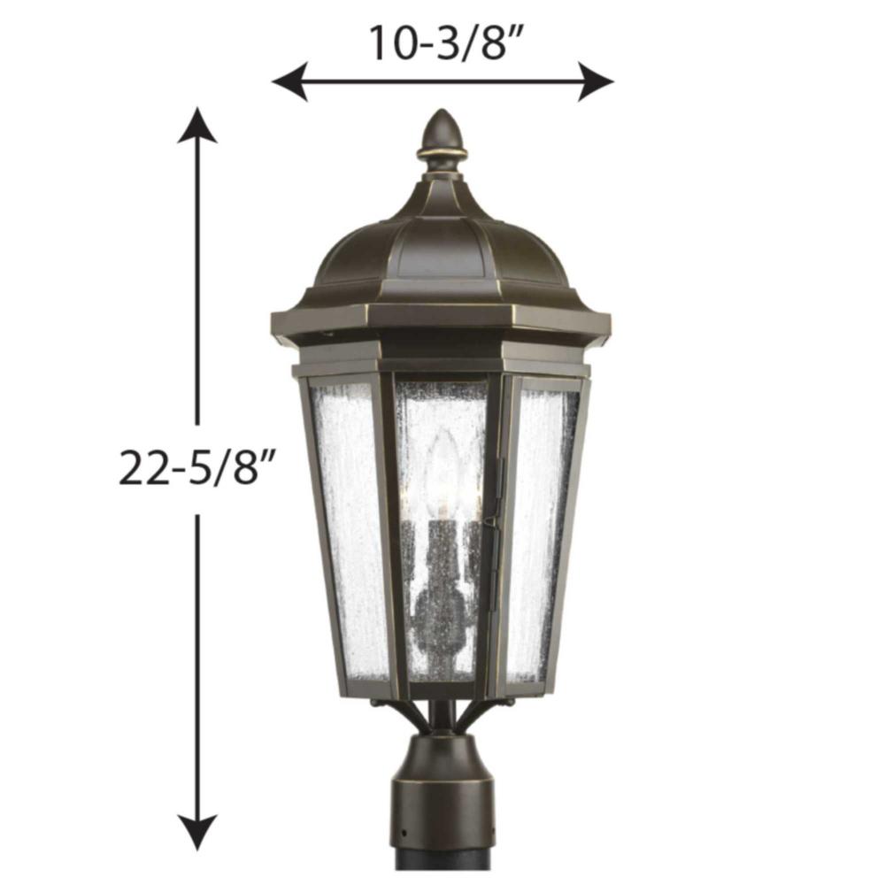 The three-light post lantern in the Verdae collection offers traditional styling for a variety of exteriors. Classic and formal clear seeded glass complements an Antique Bronze finish. Fits 3" post (order separately). Hinged door for easy access to replace lamps.