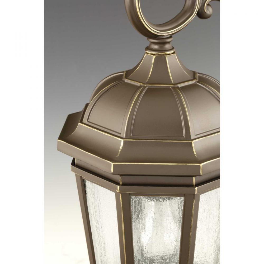 Antique Bronze finish.;Traditional style.;Classic and formal clear seeded glass.;Hinged door for easy access to replace lamps.;Fits 3" post (order separately).