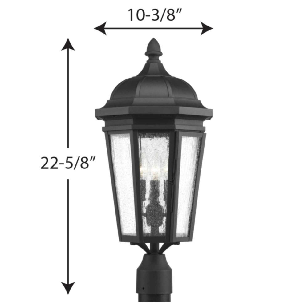 The three-light post lantern in the Verdae collection offers traditional styling for a variety of exteriors. Classic and formal clear seeded glass complements a Black finish. Fits 3" post (order separately). Hinged door for easy access to replace lamps.