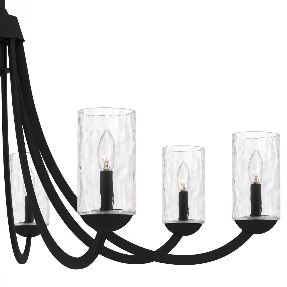 The Allard chandelier is a stunning centerpiece that commands attention. Clear water glass shades add a touch of sophistication and allow the light to shine through brilliantly. Choose from two sizes of chandelier in either matte black or brushed nickel to