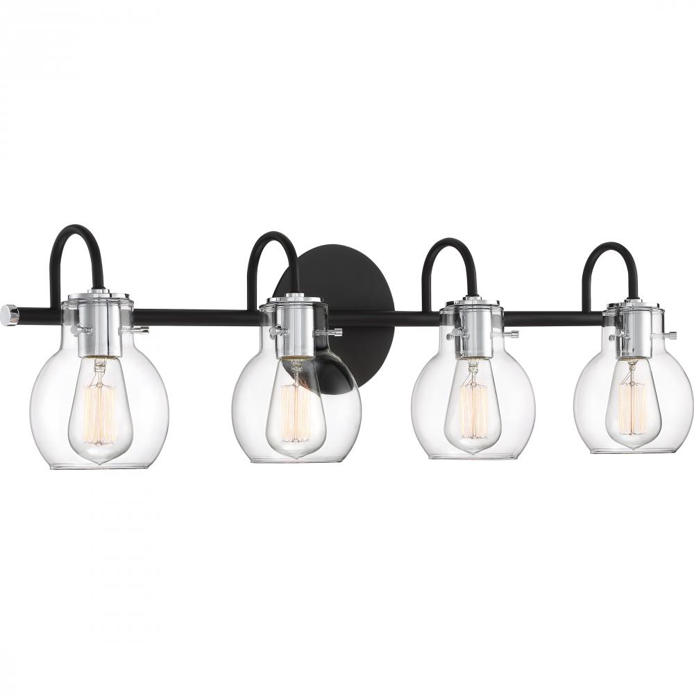 The ageless style of the Andrews Bath Collection is synonymous with classic industrial design. The clear glass shades encircle the sockets and appear as though they are floating over the vintage filament bulbs. The earth black finish on the backplate, s