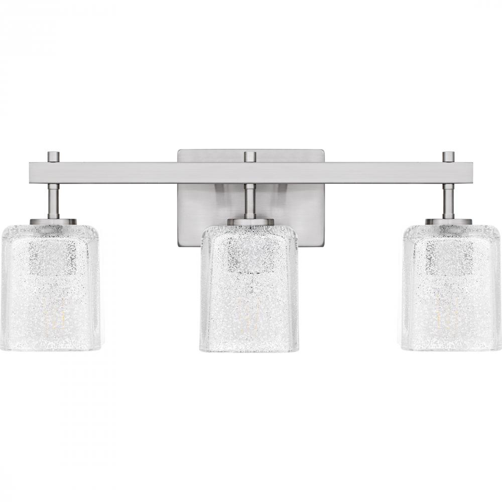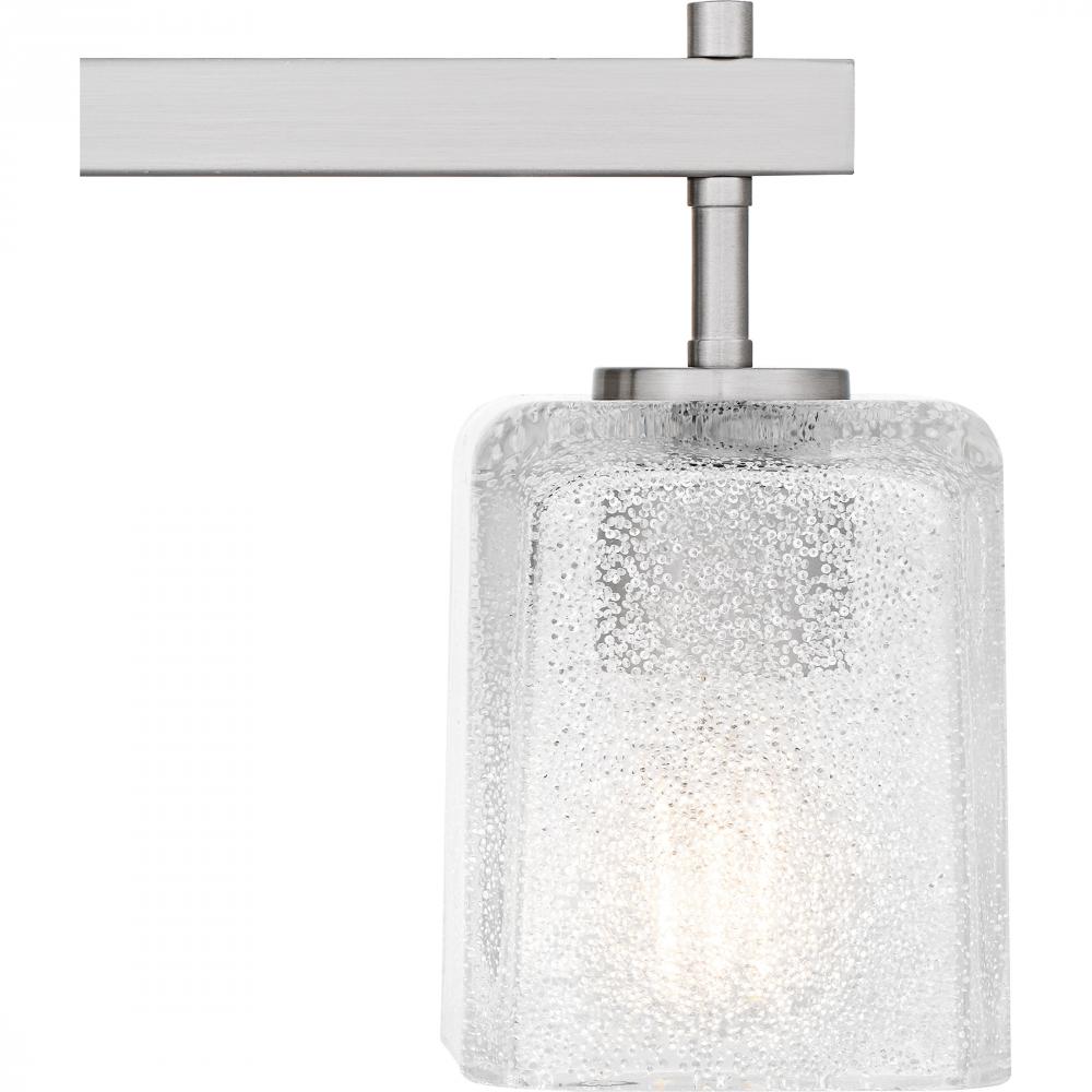 The Brenthouse bath light features a clean, minimalist design with a striking visual impact. Square glass shades cast a soft, diffused glow while adding a touch of texture to the simple silhouette. The thick glass shades feature tiny crystals on the inside