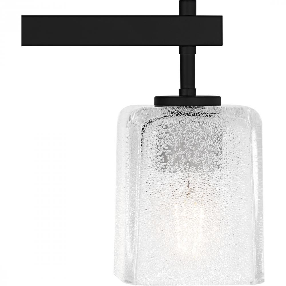 The Brenthouse bath light features a clean, minimalist design with a striking visual impact. Square glass shades cast a soft, diffused glow while adding a touch of texture to the simple silhouette. The thick glass shades feature tiny crystals on the inside