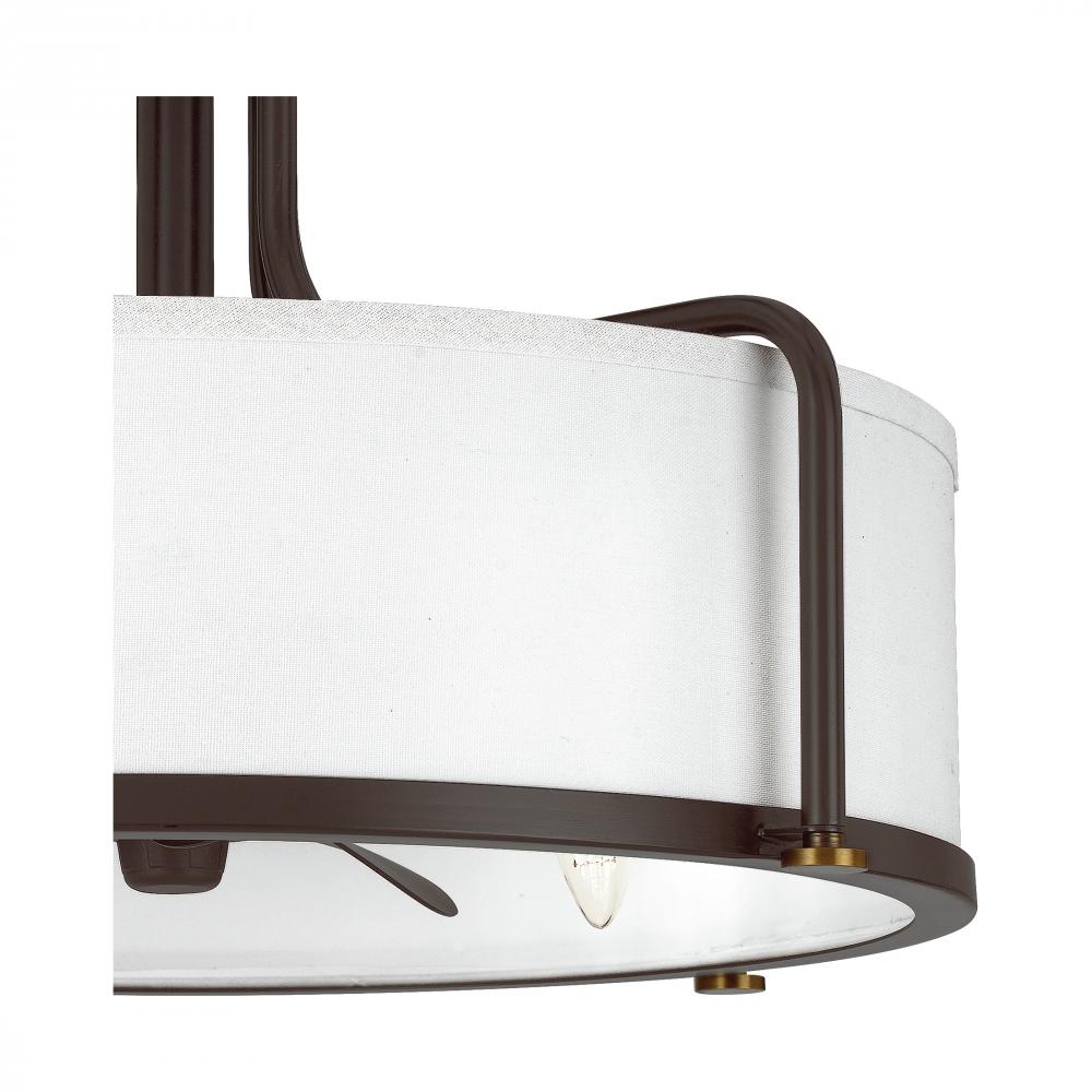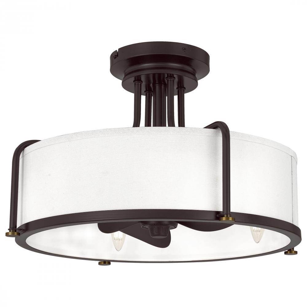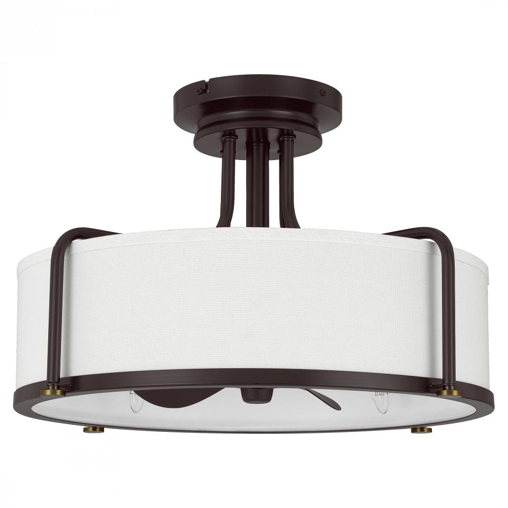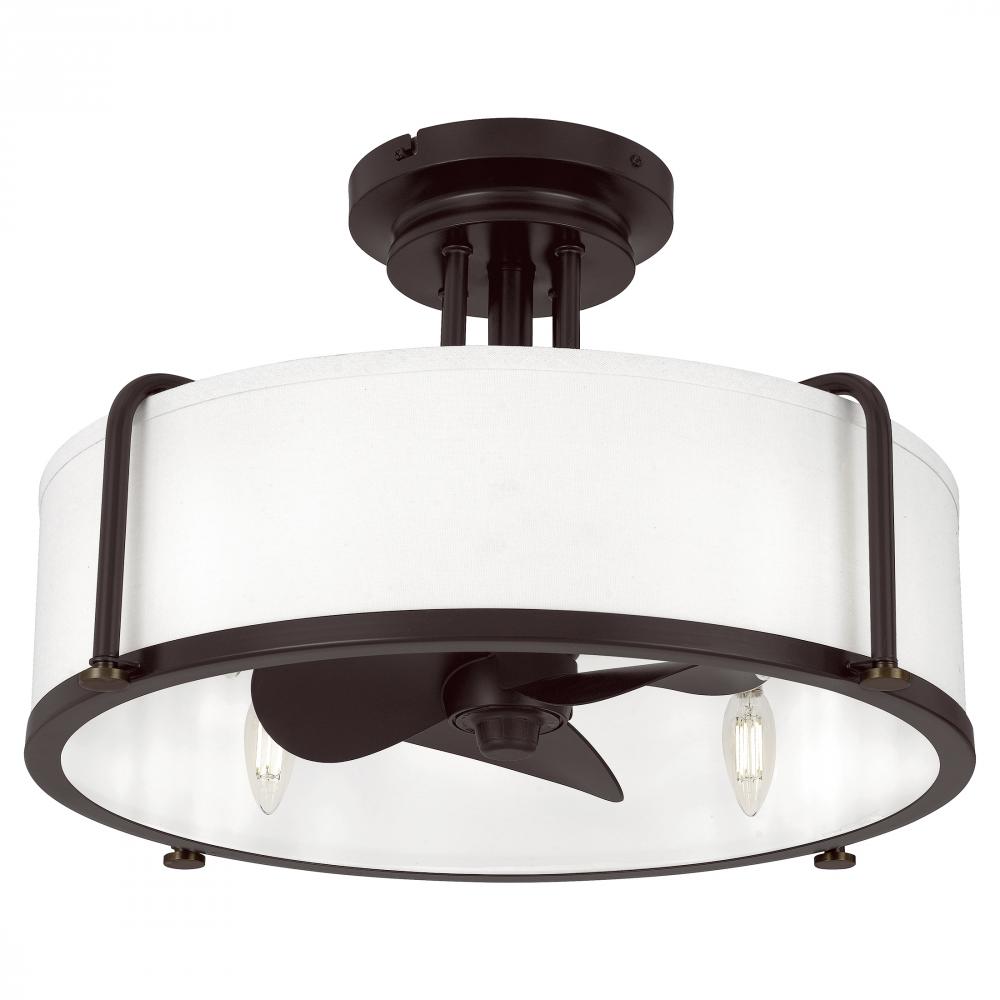 Nestled within the Calvary semi-flush mount’s white fabric shade is a vintage-inspired fan, casting both a soft glow and cool, refreshing air via a three-speed, reversible motor. Crafted from steel in a handsome western bronze finish, this piece is supre