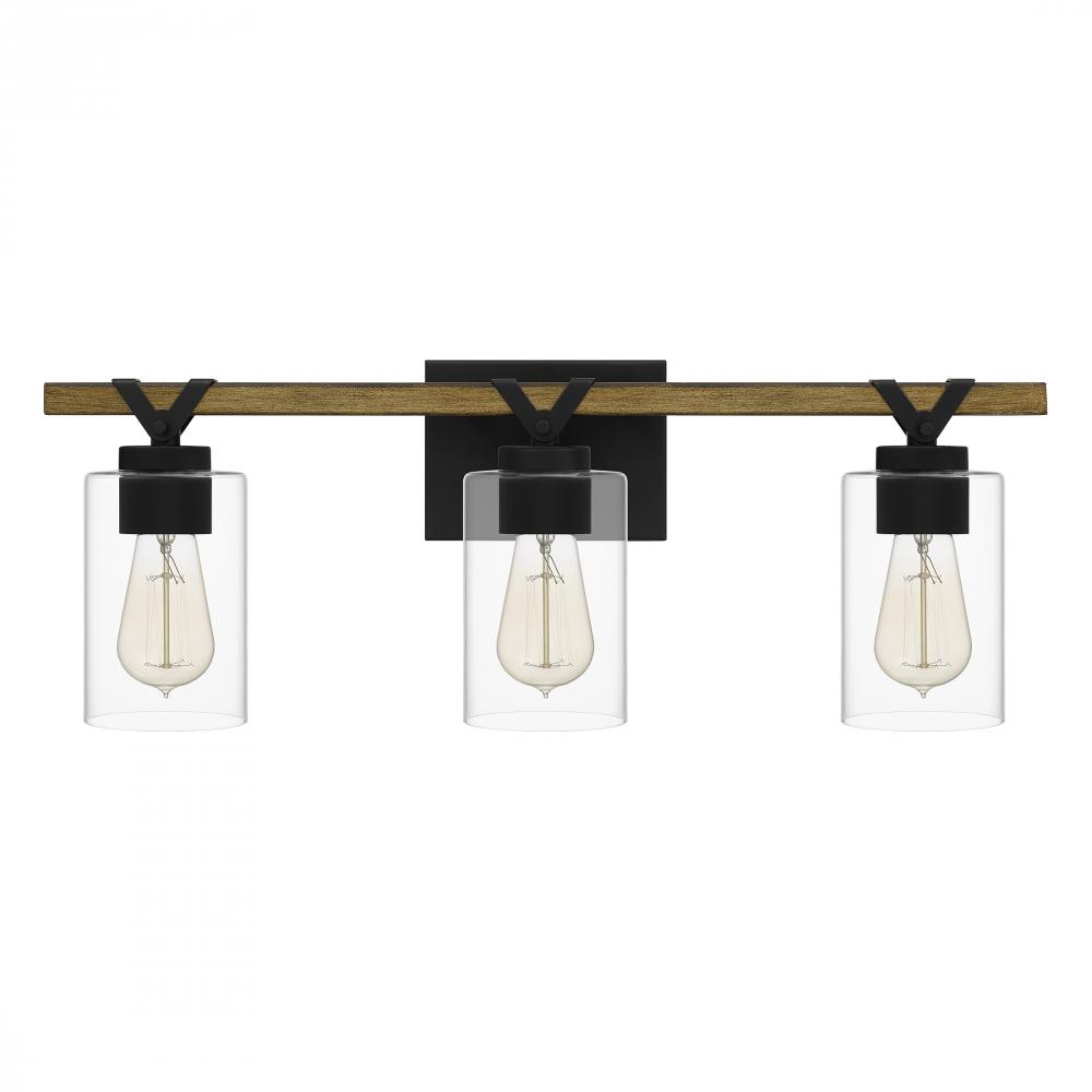The Devon Court bath light is the perfect companion to industrial or farmhouse-inspired design schemes. This light, which can be configured facing up or down, pairs a matte black finish with a rustic wood accent. Clear glass cups — available in one-, two