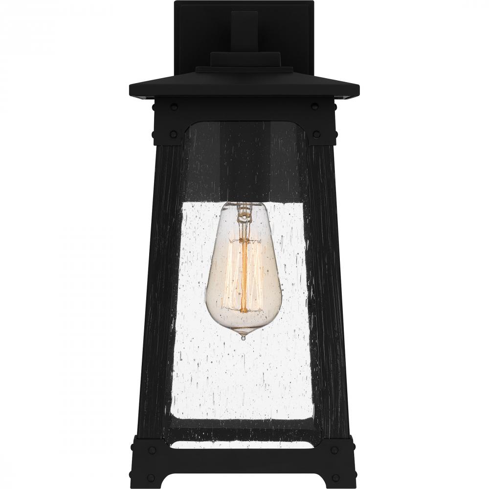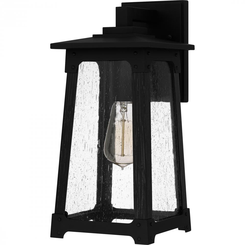 Update your homes exterior with Drescher wall lanterns. These handsome outdoor wall lights feature a matte black finish that is embellished with black wood accents for a touch of modern farmhouse style. Clear seedy glass completes the look, adding visual i