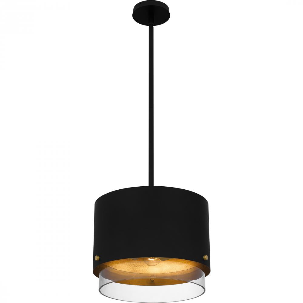 Eilo pendants illuminate modern industrial style with a matte black and gold palette. The outer matte black shade features a subtle pattern for added depth and texture, while the inner clear glass shade adds contrast and shine.