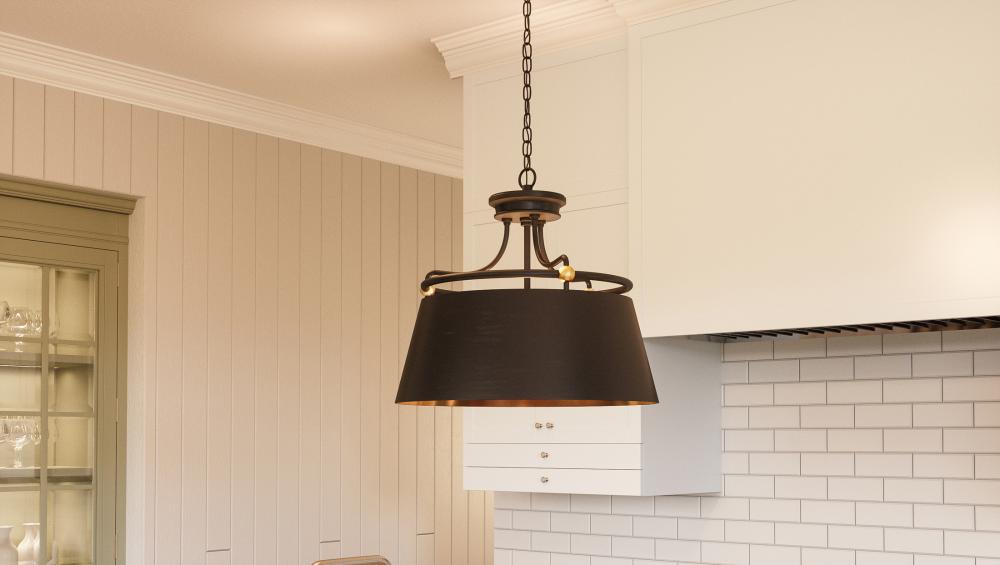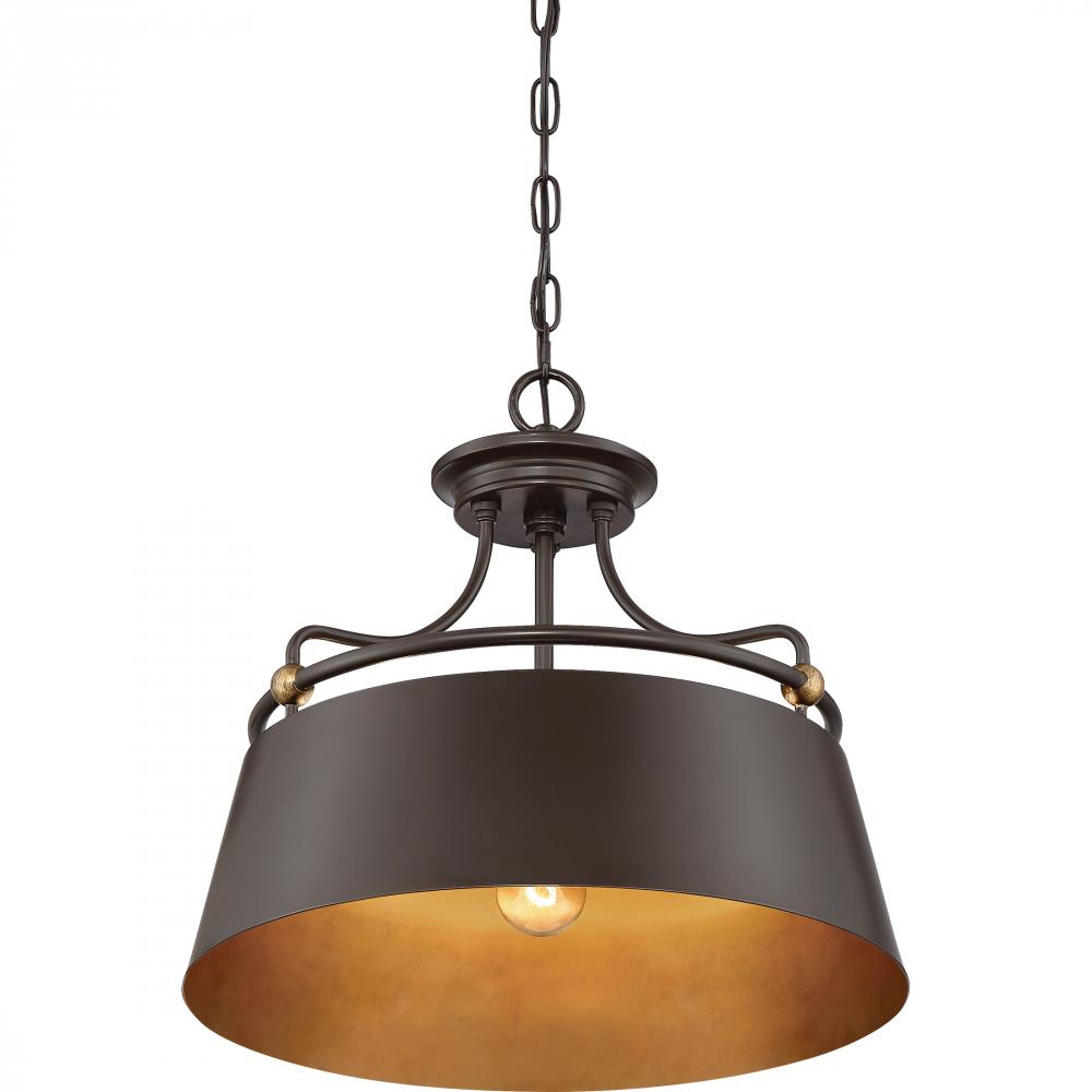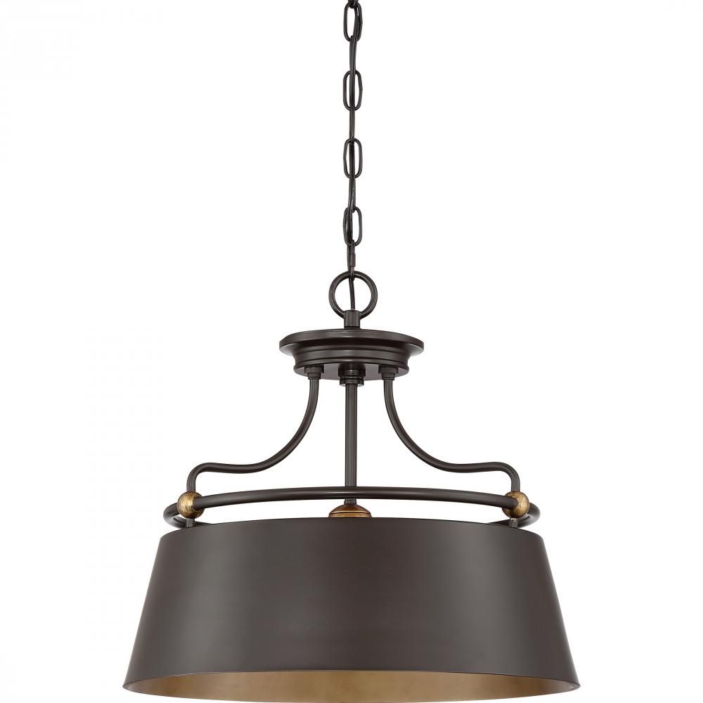 A softly curved frame and simple drum create quite a statement with the Fairview Pendant. The rich western bronze finish on the frame and exterior of the shade emphasizes the brassy highlights on the ball accents. A weathered brass finish is used on the