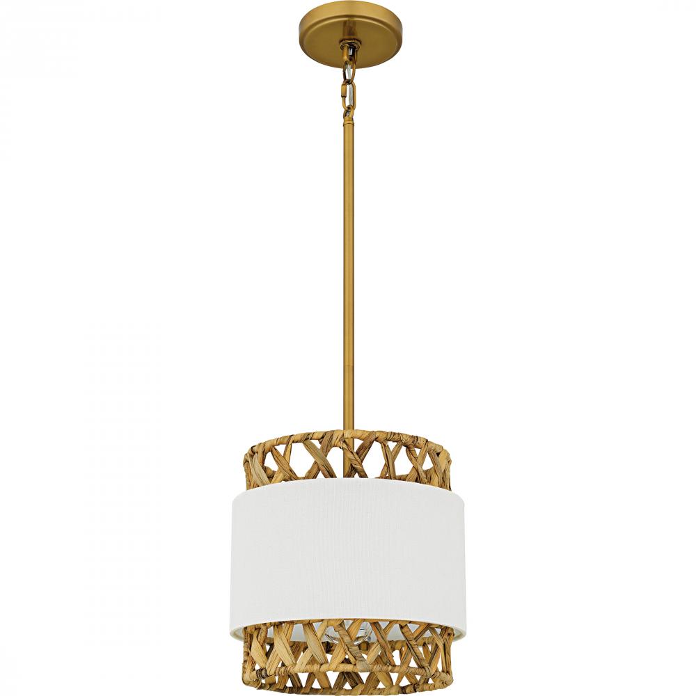 Part of the Quoizel Naturals series, Kate makes a distinctive statement with its combination of rattan and fabric shades. Finished in brushed gold, Kate embodies coastal style with its natural and elegant design elements. Available as a pendant, mini penda